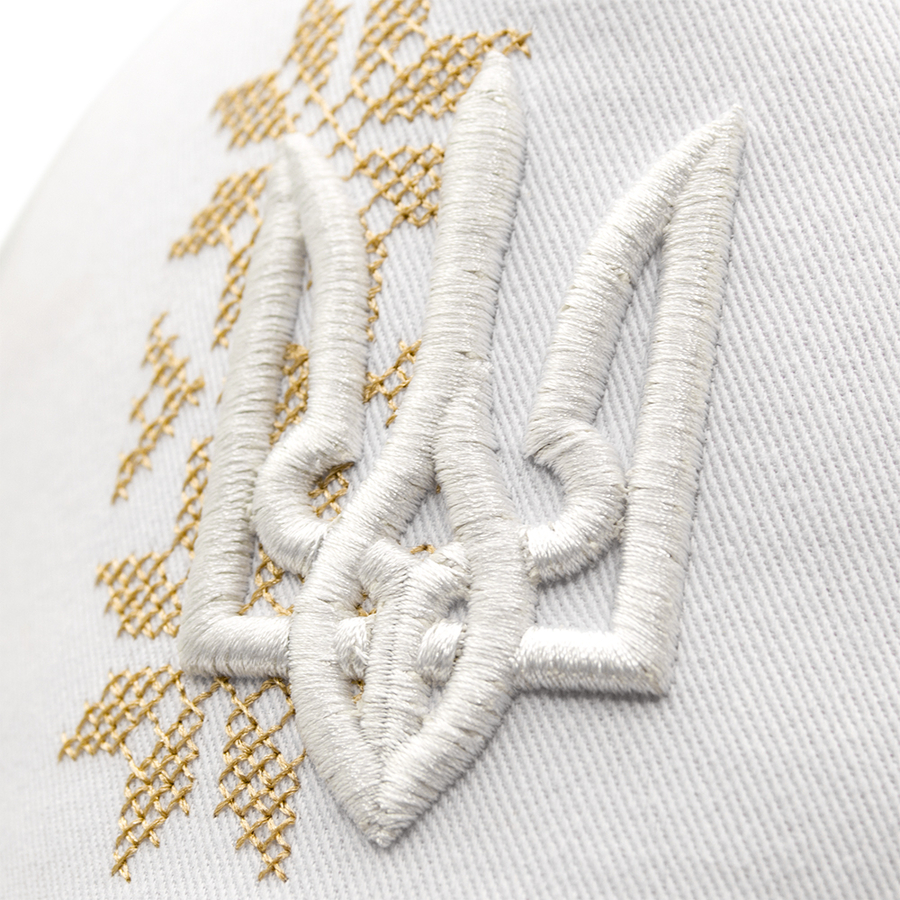 Бейсболка белая 3D Тризуб с золотым орнаментом Звезда Матери (uac-039) Стильная патриотическая бейсболка с большой вышивкой (3D). Состав: 78% коттон, 22% полиэстер. Подкладка: 100% коттон