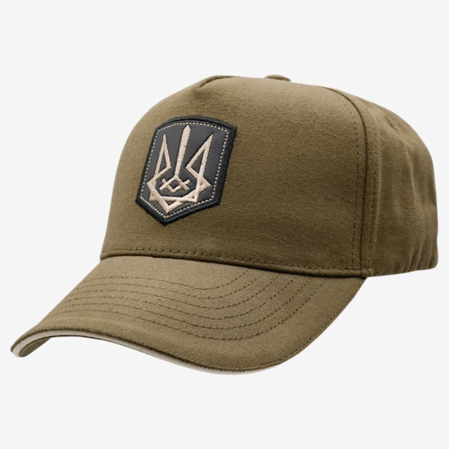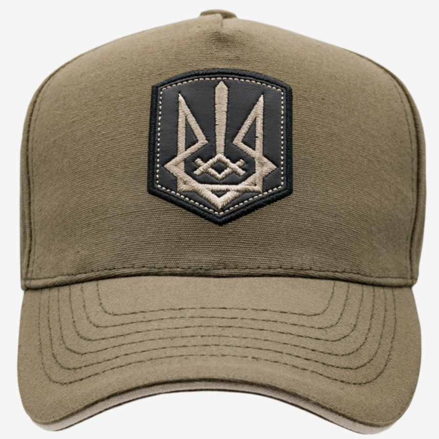 Бейсболка хаки с патчем Тризуб (uacp-005) Материал 78% хлопок, 22% полиэстер, подкладка 100% хлопок. Стильная бейсболка с патчем. Патч сделан из экокожи, прошит по краям и вышит нитями. Размер 56-58, но сзади можно отрегулировать тем самым увеличить или снизить размер.