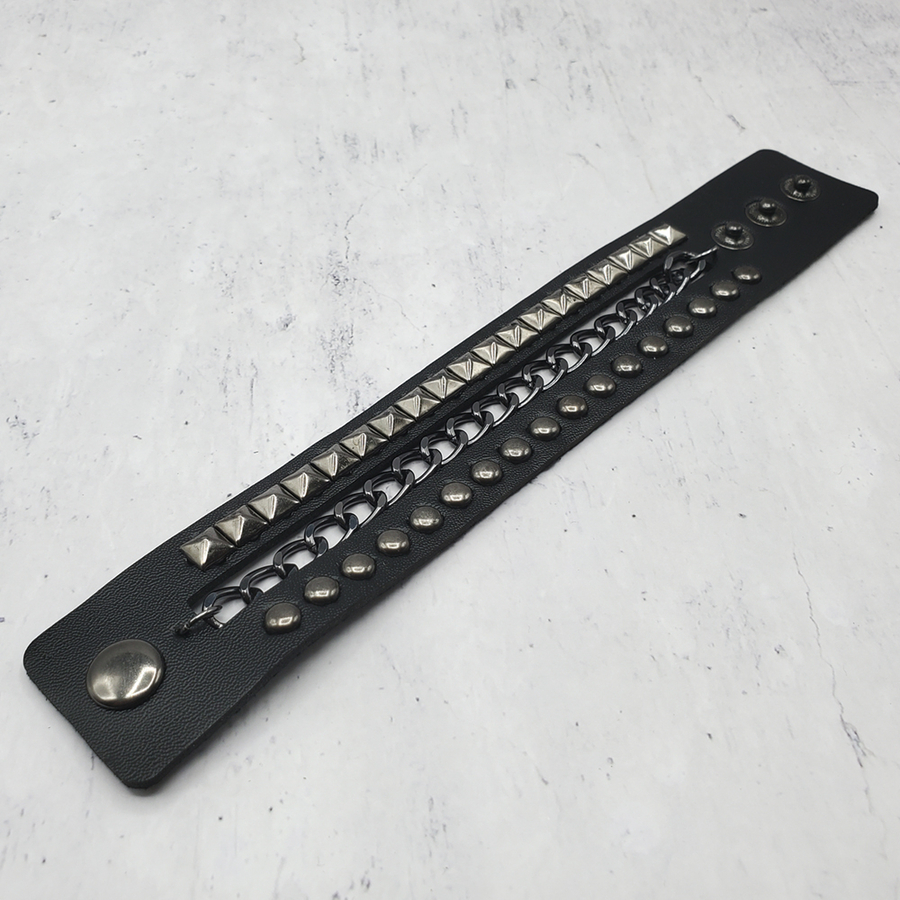 Браслет с заклепками, пирамидой и цепочкой (bpu-004)Браслет выполнен из полиуретановой кожи (экокожи) с металлической фурнитурой, с кнопочными застежками.Полиуретановая кожа (экокожа) экологична и схожа с натуральной кожей.Материал имеет ценные преимущества:- повторяет фактуру и гибкость натурального аналога:- не мешает телу «дышать» благодаря микропористой структуре;- не растрескивается при использовании;- сохраняет мягкость на морозе; нет резкого запаха.