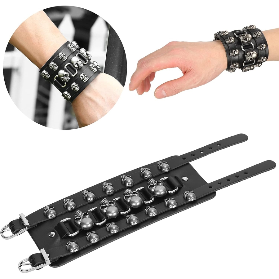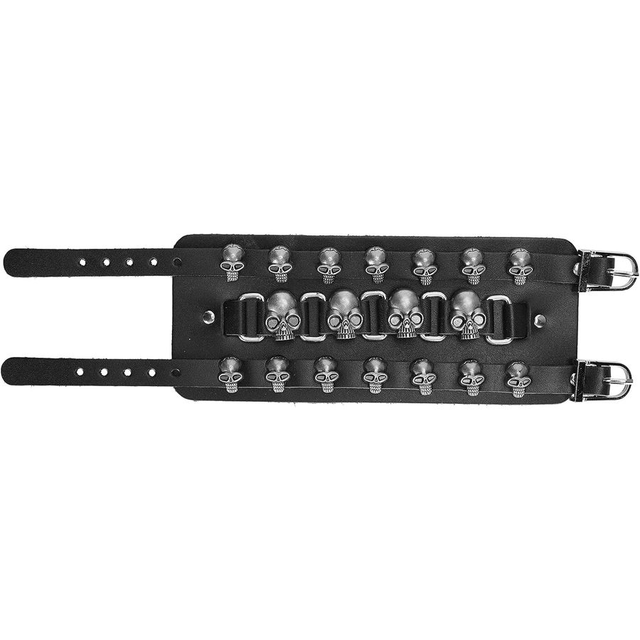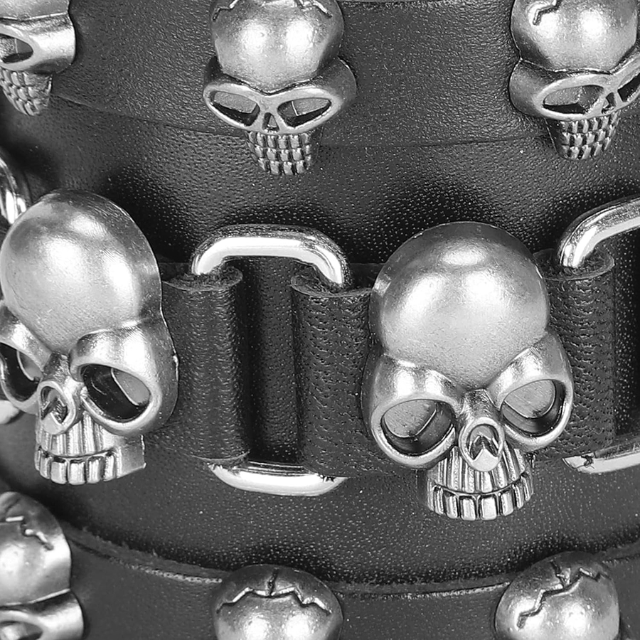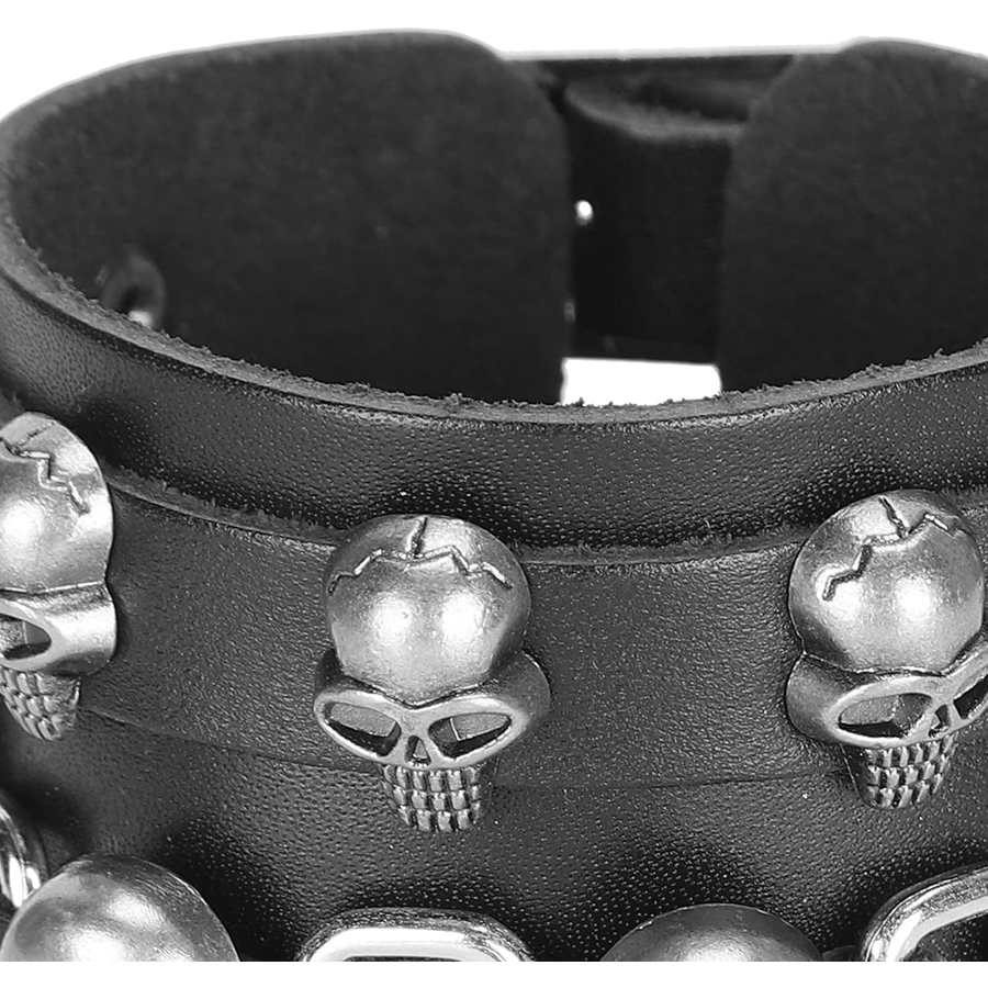 Браслет три ряда черепов с секционной вставкой (bl-170) Общая длина 26 см, ширина 7 см. Браслет выполнен из натуральной кожи с использованием металлической фурнитуры, имеет застежки ременного типа.