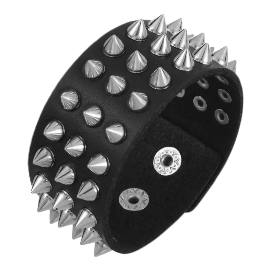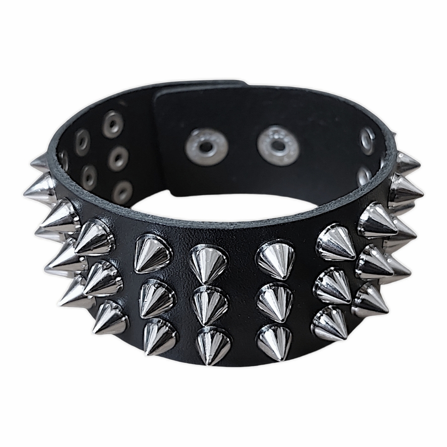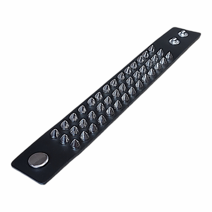 Браслет три ряда маленьких шипов (bpu-026) Браслет выполнен из полиуретановой кожи (экокожи) с металлической фурнитурой, с кнопочными застежками. Полиуретановая кожа (экокожа) экологична и схожа с натуральной кожей. Материал имеет ценные преимущества: - повторяет фактуру и гибкость натурального аналога: - не мешает телу дышать благодаря микропористой структуре; - не растрескивается при использовании; - сохраняет мягкость на морозе; нет резкого запаха. Длина: общая 22,5 см, между кнопками 18 и 20 см; ширина 3 см