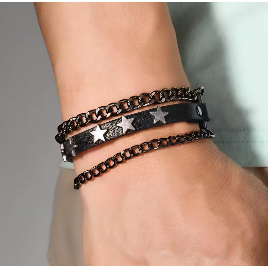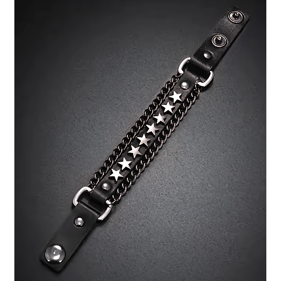 Браслет со звездами и двумя цепочками (bpu-037) Браслет выполнен из полиуретановой кожи (экокожи) с металлической фурнитурой, с кнопочными застежками. Полиуретановая кожа (экокожа) экологична и схожа с натуральной кожей. Материал имеет ценные преимущества: - повторяет фактуру и гибкость натурального аналога: - не мешает телу дышать благодаря микропористой структуре; - не растрескивается при использовании; - сохраняет мягкость на морозе; нет резкого запаха. Подходит на объем от 20 до 23 см, ширина 3 см.