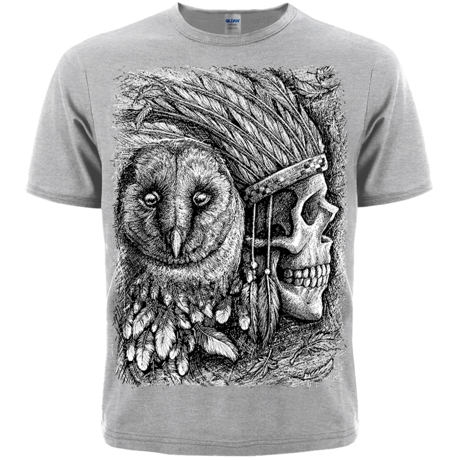 Футболка Indian Skull & Owl (меланж)производство: Gildan;ткань: 100% хлопок (качественные швы, горловина не растягивается). Плотность 160 г/м²рисунок нанесен методом шелкотрафаретной печати (не трескается, не выстирывается, не выгорает);рисунок: краска пластизолевая производства EU.Стирать при температуре не выше 30°