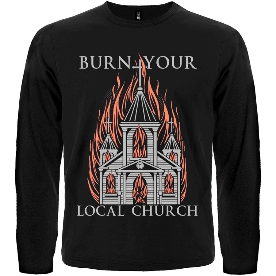 Футболка с длинным рукавом Burn Your Local Churchпроизводитель: Rockway;ткань: 100% хлопок (качественные швы, горловина не растягивается);рисунок нанесен методом шелкотрафаретной печати (не трескается, не выстирывается, не выгорает);рисунок: краска пластизолевая производства EU.Стирать при температуре 30°