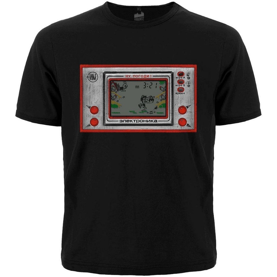 Футболка стандартного кроя с круглым вырезом горловины. Имеет оригинальный яркий принт Электроника "Ну, погоди!", который нанесен методом шелкотрафаретной печати.