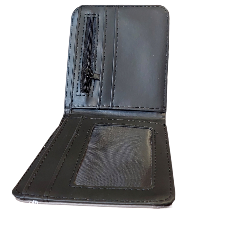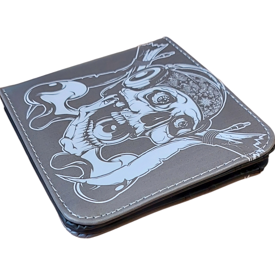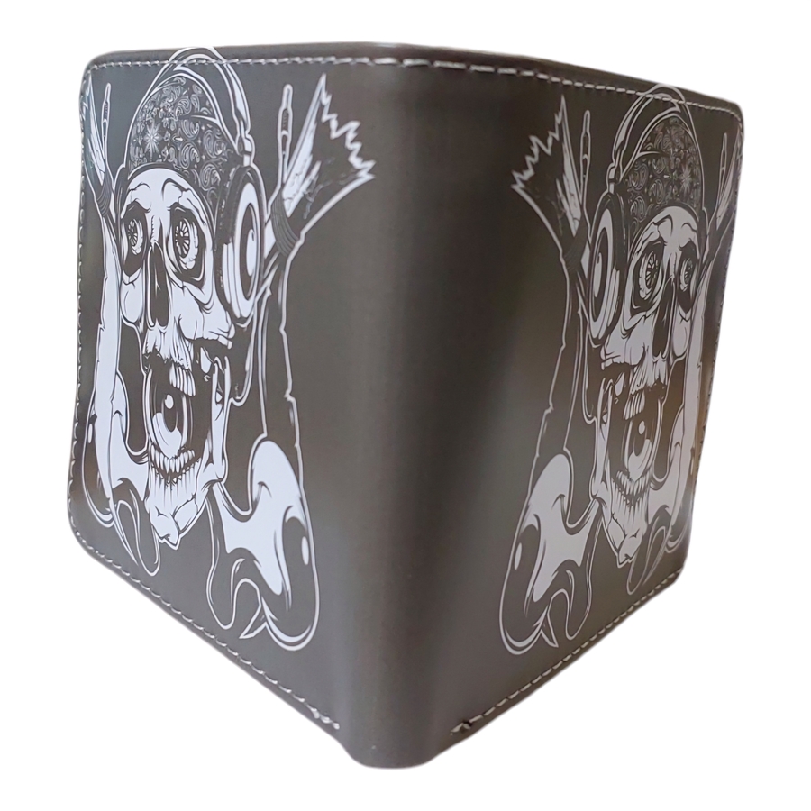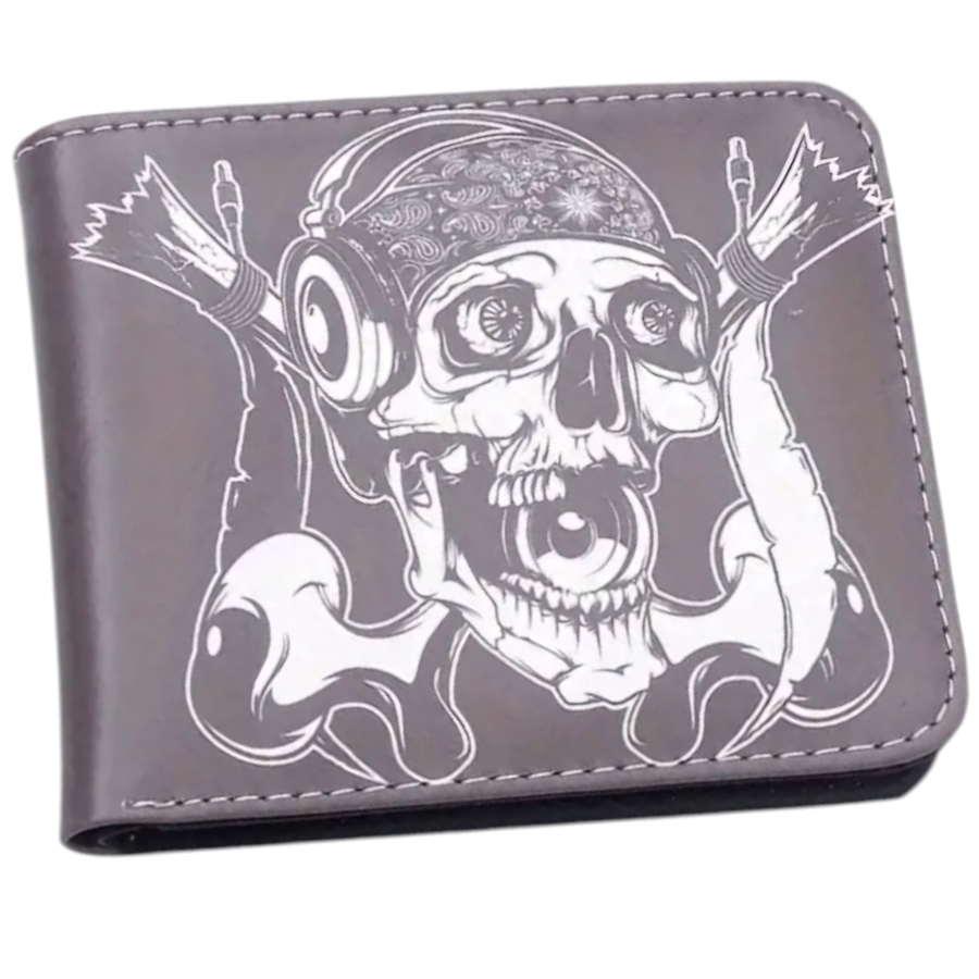 Кошелёк Музыкальный череп Материал: экокожа Рисунок нанесен методом шелкотрафаретной печати. В кошельке два больших отделения для купюр, два отделения для кредитных карт или визиток, одно отделение на молнии для монет, боковые дополнительные карманы и карман с окошком. Размеры кошелька: высота 9,5 см, ширина 11 см.