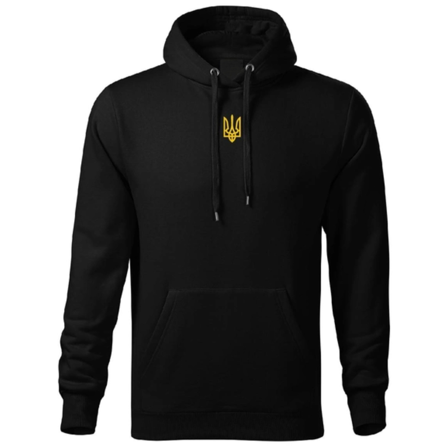 Худи черное с вышитым Тризубом. Худые утепленное флисом. Трезубец вышит желтой нитью. На худи есть карманы и капюшон. Состав: хлопок 95%, лайкра 5%.