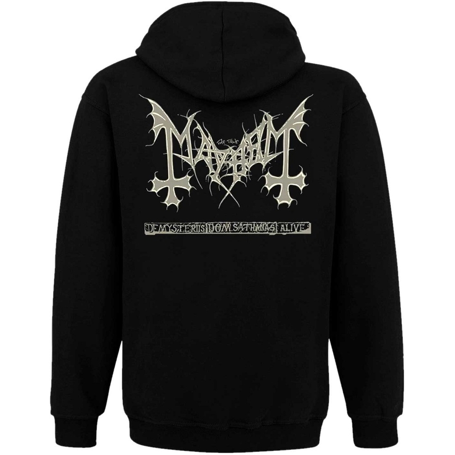 Худи Mayhem "De Mysteriis Dom Sathanas" на молниипроизводство: Rockway;ткань: 80% - хлопок, 20% - полиэстер;рисунок нанесен методом шелкотрафаретной печати (не трескается, не выстирывается, не выгорает);рисунок: краска пластизолевая производства EU.Стирать при температуре не выше 30°