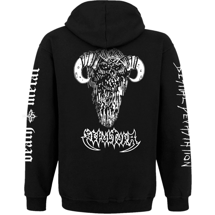 Худи Sepultura "Bestial Devastation" на молниипроизводство: Rockway;ткань: 80% - хлопок, 20% - полиэстер;рисунок нанесен методом шелкотрафаретной печати (не трескается, не выстирывается, не выгорает);рисунок: краска пластизолевая производства EU.Стирать при температуре не выше 30°
