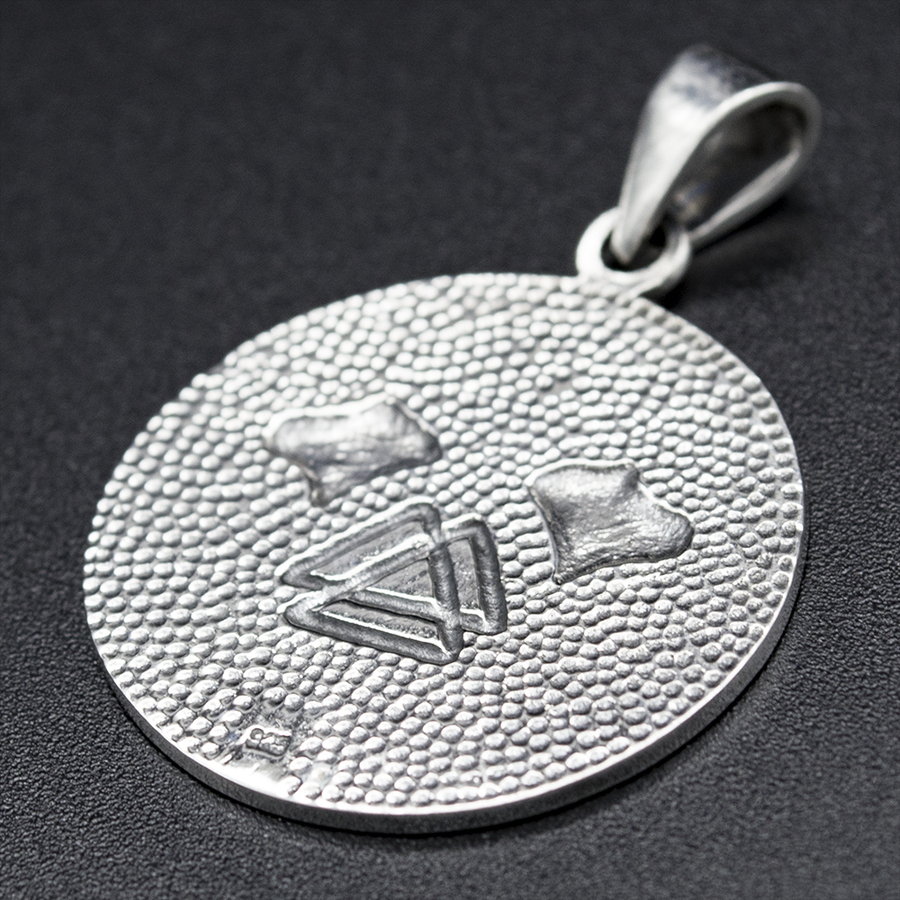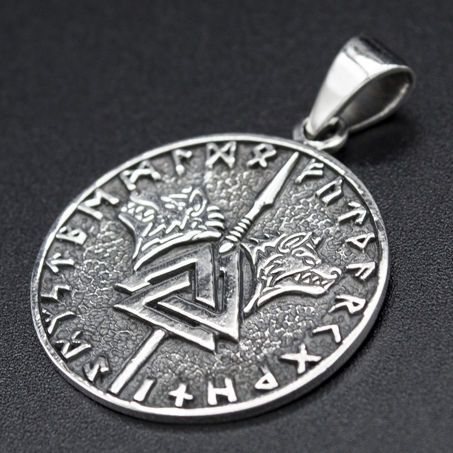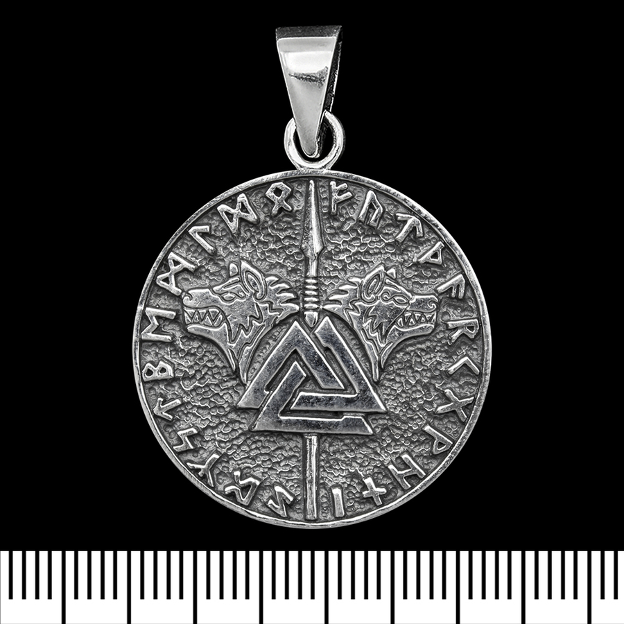 Кулон Копье Один с валкнутом и волками в руническом круге (серебро, 925 проба) (sp-236) 5,5 грамм, диаметр 27 мм, размер ушка для цепочки 7х4 мм