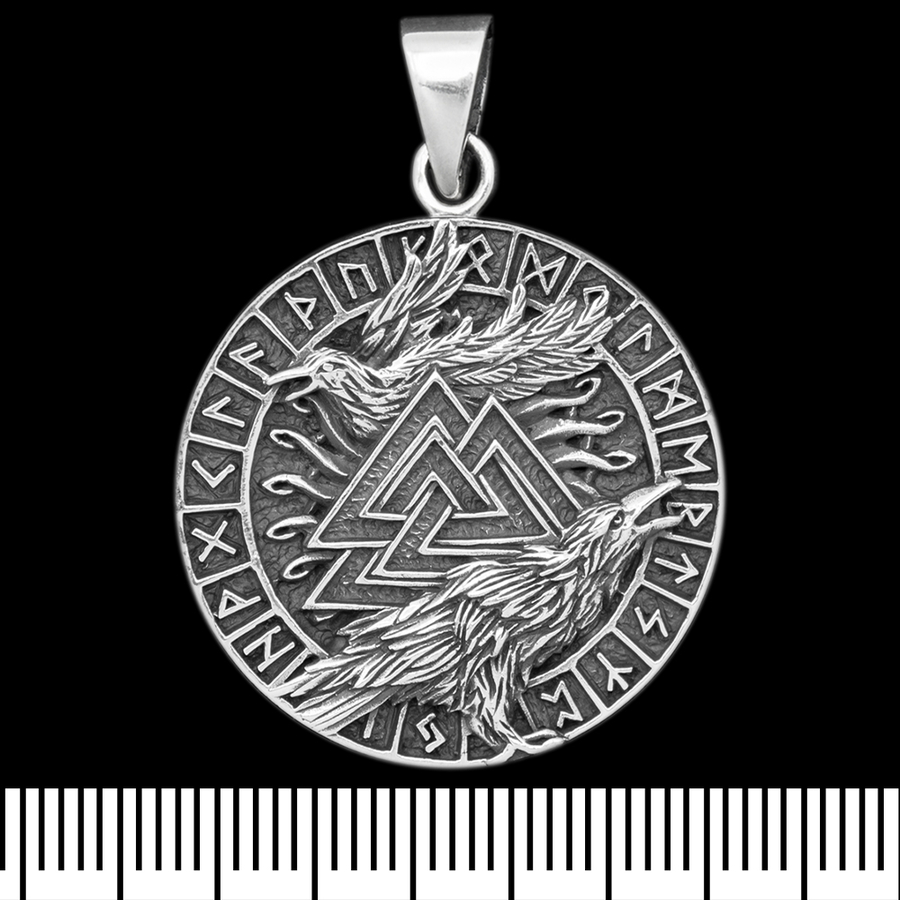 Кулон Валкнут с воронами Один в футарку (серебро, 925 проба) (sp-217) 6,94 грамм, диаметр 29 мм, размер ушка для цепочки 6х4 ммм