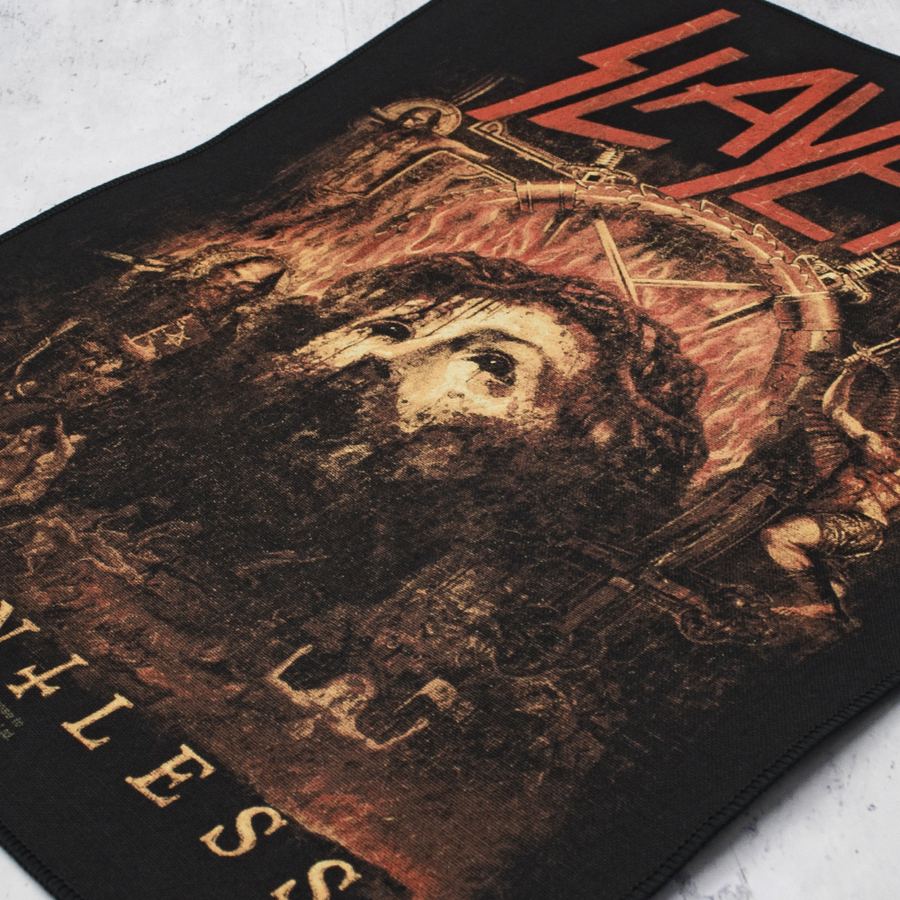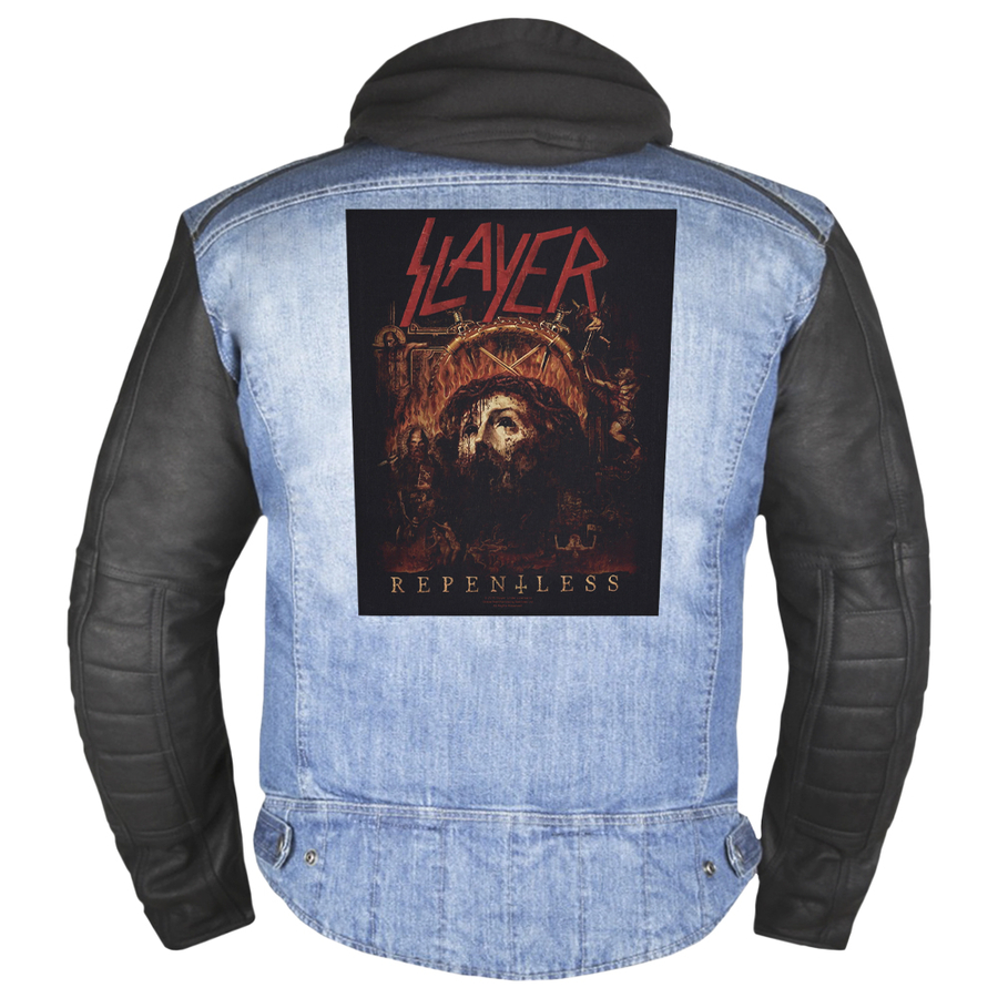 Нашивка наспинная катаная SLAYER - REPENTLESS (olbp-025) висота 35.5 см, ширина по верхньому краю 29.5 см, ширина по нижньому краю 26 см Данный товар является официальным лицензированным мерчем (Officially Licensed Backpath). Наспинная нашивка высокого премиум качества. Края нашивки обработаны оверлоком благодаря чему изделие выглядит максимально аккуратным. Изображение нанесено методом шелкотрафаретной печати, высокая детализация свидетельствует о непревзойденном качестве изделия. Нашивка пришивная, мягкая, будет идеально повторять изгибы на одежде. Состав ткани : хлопок/полиэстер. Сделано в Великобритании