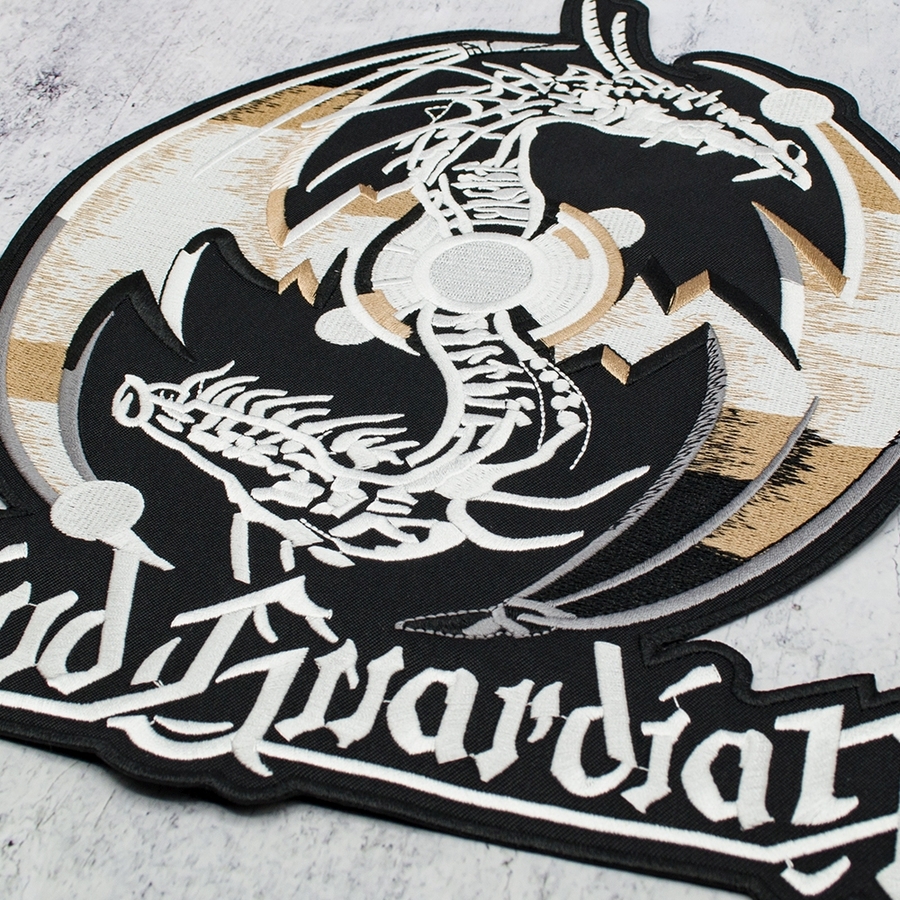 Нашивка термо Blind Guardian (dragons logo) наспинная (thps-065) Размер - ширина 25.5 см, высота 29 см Высококачественная термонашивка с детализированной машинной вышивкой. Производство: Таиланд. Способ применения: с обратной стороны нашивки находится термопленка. На ровную разглаженную ткань к размеченной области приложите термонашивку, с изнанки или через тонкую ткань (например марлю) с наружной стороны прогладьте предварительно разогретым утюгом. Особое внимание уделите углам и краям. Внимание: соблюдайте температурный режим для ткани на которую будете закреплять нашивку, чтобы не повредить изделие.
