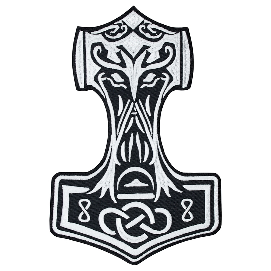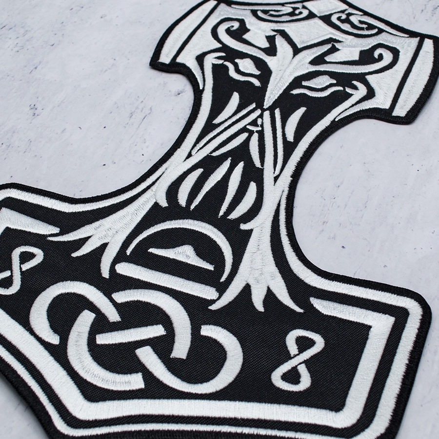 Нашивка термо Молот Тора (Тор) наспинная (thps-066) Размер - ширина 16 см, высота 24,5 см Высококачественная термонашивка с детализированной машинной вышивкой. Производство: Таиланд. Способ применения: с обратной стороны нашивки находится термопленка. На ровную разглаженную ткань к размеченной области приложите термонашивку, с изнанки или через тонкую ткань (например марлю) с наружной стороны прогладьте предварительно разогретым утюгом. Особое внимание уделите углам и краям. Внимание: соблюдайте температурный режим для ткани на которую будете закреплять нашивку, чтобы не повредить изделие.