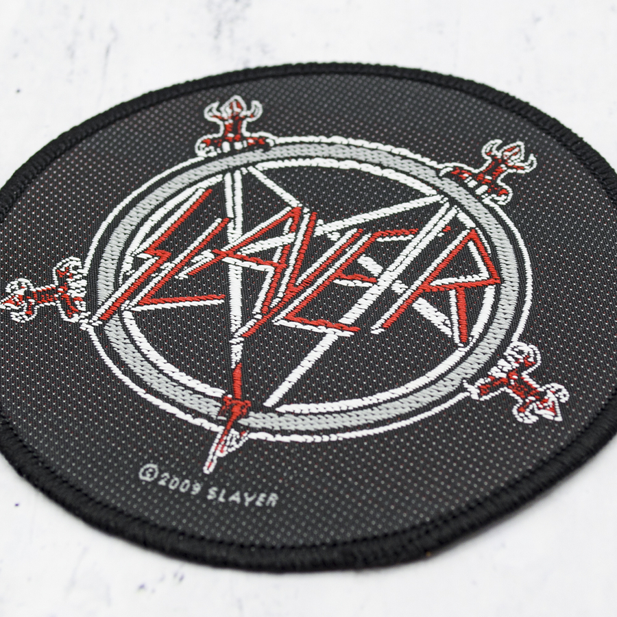 Нашивка тканая SLAYER - PENTAGRAM (ofp-299) 9 см Данный товар является официальным лицензированным мерчем. Вытканная нашивка высокого качества и детализации. Края нашивки обработаны оверлоком благодаря чему изделие выглядит максимально аккуратным. Нашивка пришивная. При необходимости к нашивке можете пришить липучку, для того чтобы закрепить ее на одежде, рюкзаке и т.д. там где уже есть место под подобные аксессуары. Состав ткани : полиэстер. Сделано в Великобритании