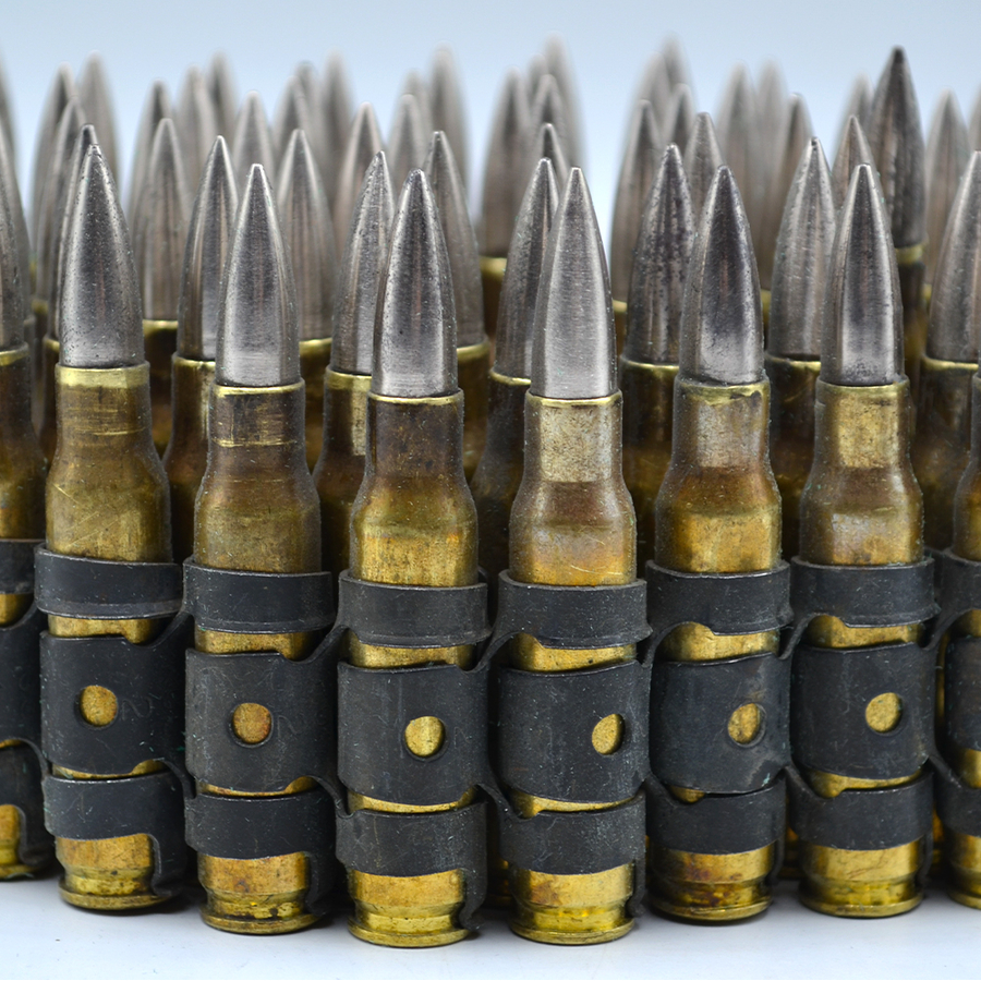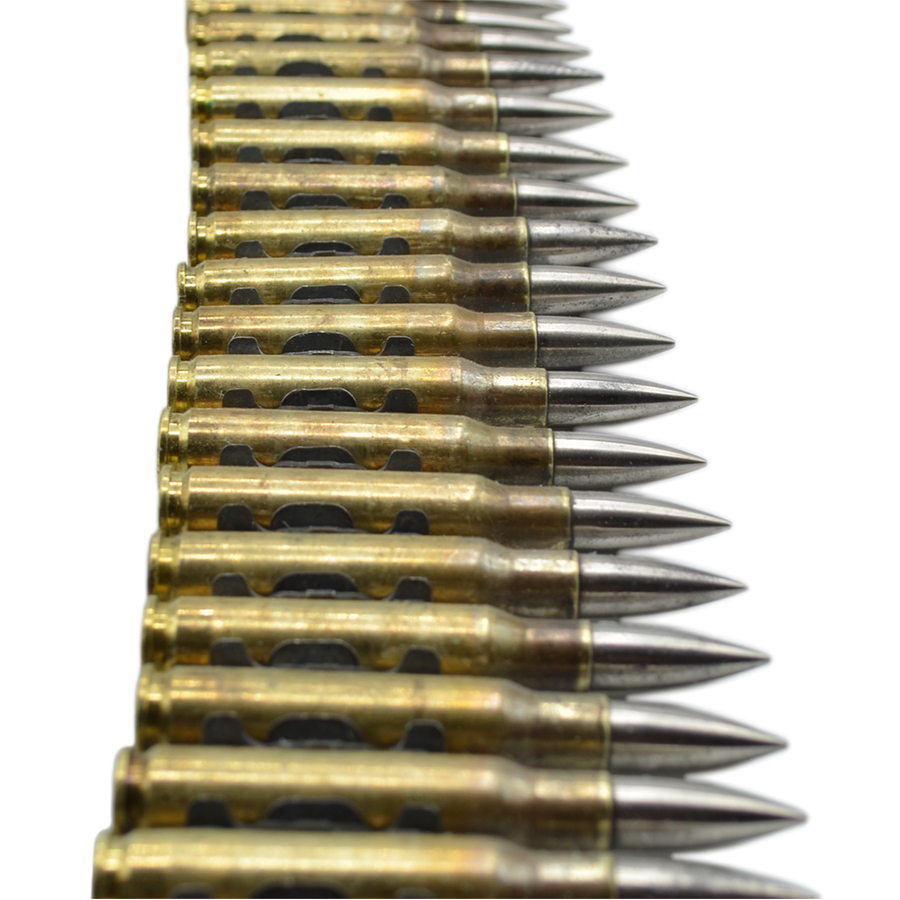 Патронташ MG-42 Длина 1 метр. Материалы: Гильза латунь, пуля мельхиор, лента вороненая сталь. Главная особенность ленты это рассыпные звенья. Каждое звено это самостоятельный замок, что позволяет регулировать общую длину без каких либо инструментов. Инструкция проста - извлеките патрон и разъедините звенья, также в обратном порядке - присоедините звено и вставьте патрон чтобы увеличить длину. Патронташ от MG-42 модернизированного под натовский калибр 7.62х51 мм.