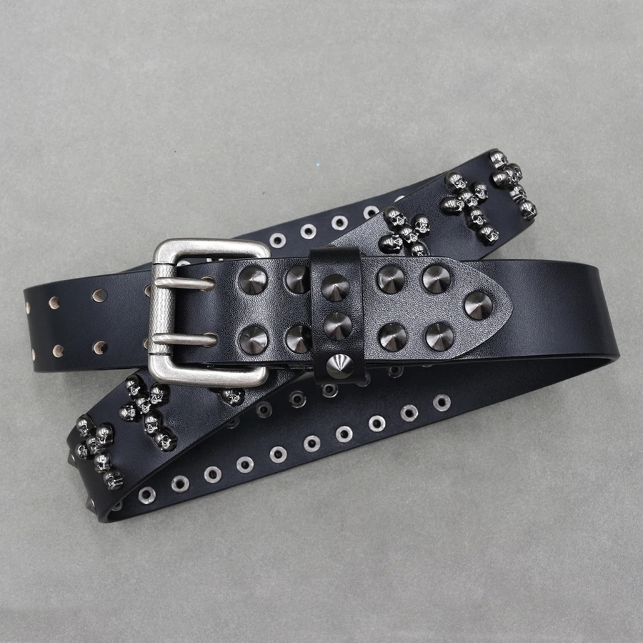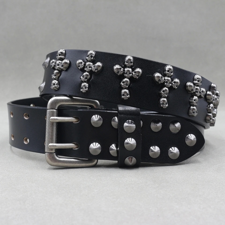 Ремень кожаный Два ряда конусных шипов и кресты из черепов (bсl-003)