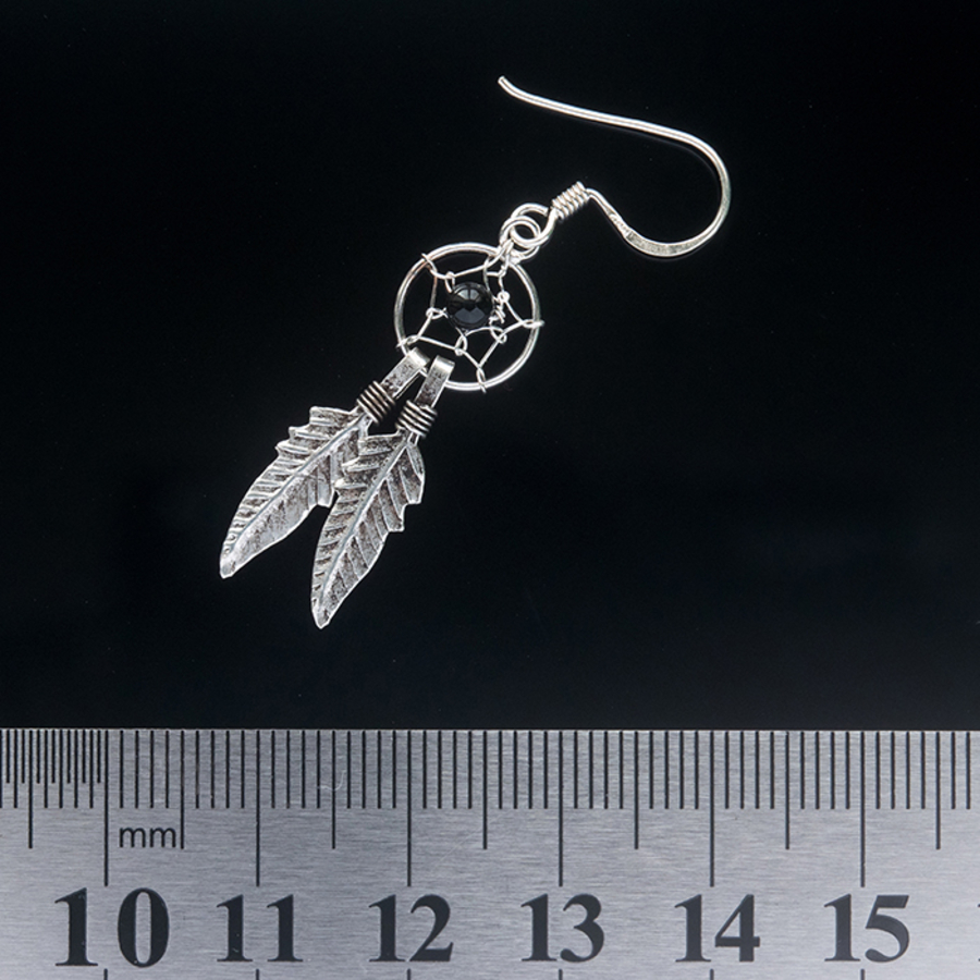 Серьга, ловец снов маленький с черным камнем (диаметр 10 мм, серебро 925 проба) (eas-046)