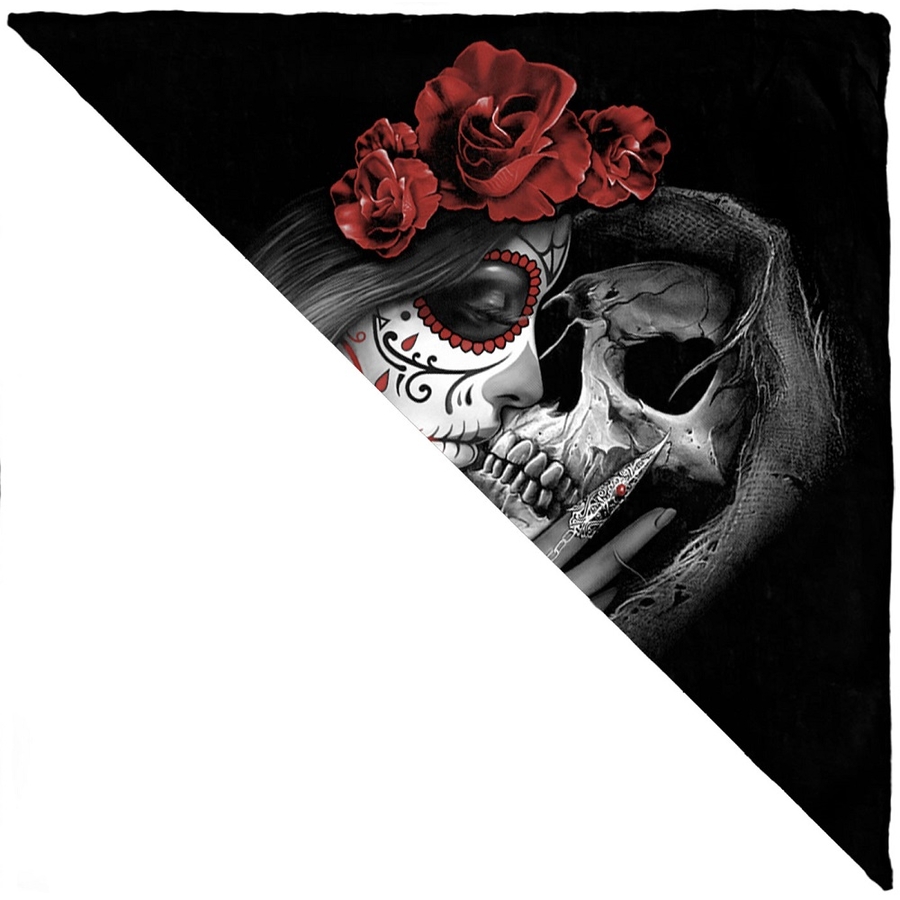 Бандана Muerte (Kiss of Death) Розмір: 55х55 см;виробництво: Україна;тканина: 100% бавовна;малюнок нанесений методом шовкотрафаретного друку (не тріскається, не псується внаслідок прання, не вигорає);малюнок: фарба пластизольна виробництва EU.Рекомендується прати в автоматичній пральній машині. Прати при температурі не вище 30 ° на делікатному режимі з мінімальним віджимом. Ручне прання вкрай не рекомендується так як тертя може привести до пошкодження малюнка. Сушити природним шляхом. Прасувати по необхідності навиворіт через вологу тканину.