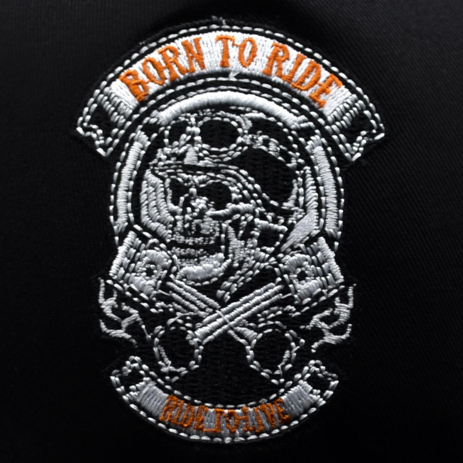 Бейсболка вишита Born To Ride, Ride To Live (skull)Високоякісна бейсболка преміум класу з вишивкою.Матеріал: 90% бавовна, 10% поліестер.Без розміру. Обсяг регулюється ремінцями з "липучкою".Виробництво: EU.