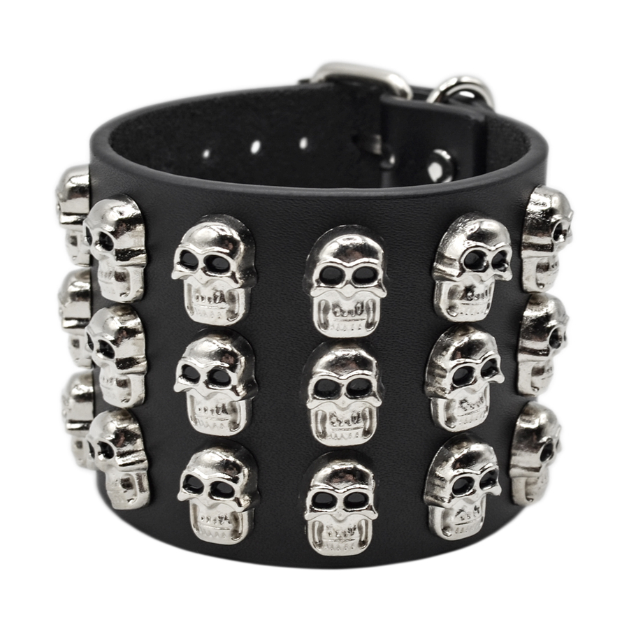 Браслет шкіряний (bfl-025) три ряди черепів Високоякісна товста шкіра, високоякісна металева фурнітура. Довжина від застібки до отворів 18-22 см. Виробництво EU