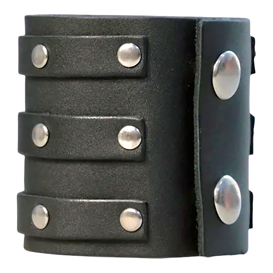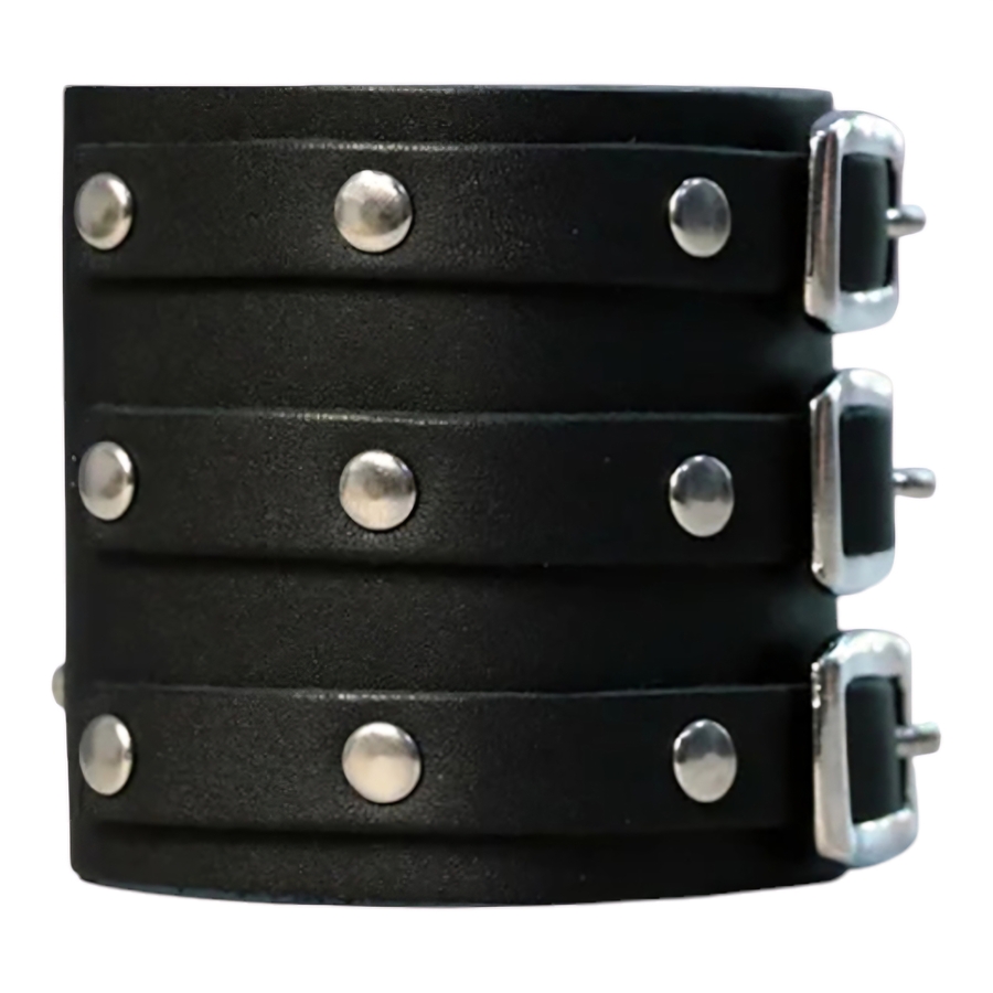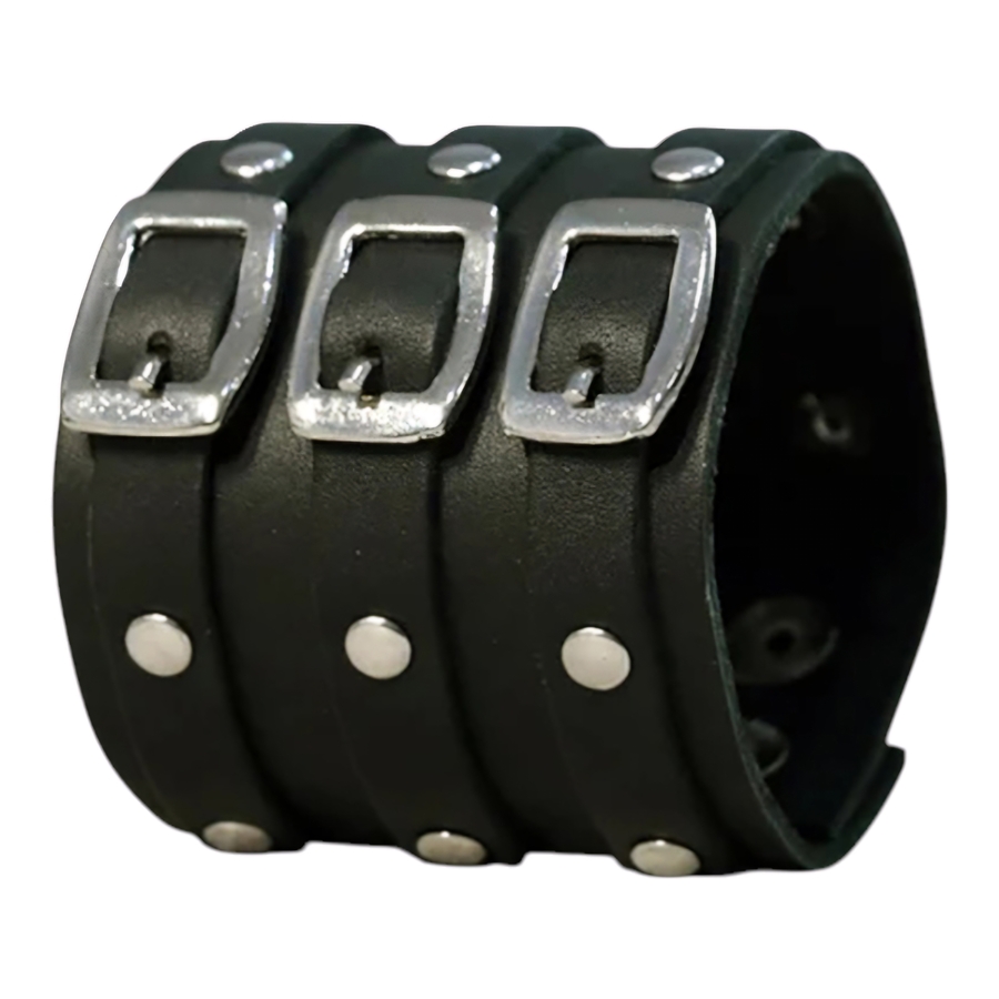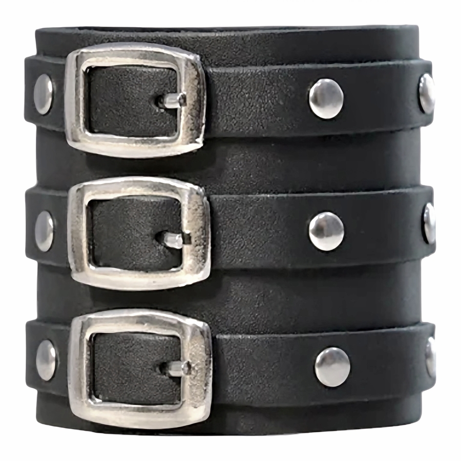 Браслет три ремінці з пряжками та хольнітенами (bpu-032) Довжина між кнопками від 19,5 до 21,5 см, загальна довжина 23,5 см, ширина 8 см. Браслет виконаний з поліуретанової шкіри (екошкіри) з металевою фурнітурою, з кнопковими застібками. Поліуретанова шкіра (екошкіра) екологічна і схожа з натуральною шкірою. Матеріал має цінні переваги:- повторює фактуру та гнучкість натурального аналога: - не заважає тілу «дихати» завдяки мікропористій структурі; - не розтріскується під час використання; - зберігає м'якість на морозі; немає різкого запаху.