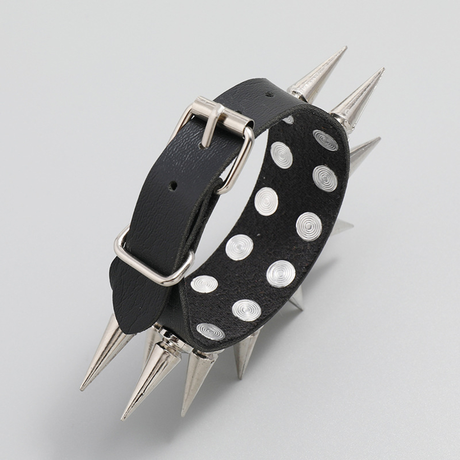 Класика рок-атрибутики, створена для шанувальників Punk, Hardcore, Metal, Gothic, Dark Aesthetic та є центральним акцентом вашого образу, заявляючи про приналежність до драйвового світу важкої музики, символом бунту проти системи та візуальної агресії. Також подібні браслети - незамінна річ для музикантів, виступів на сцені, тематичних фотосесій або відвідування рок-концертів. Найкраще цей браслет виглядає у поєднанні з чорним одягом, металевими ланцюгами або іншими шкіряними аксесуарами. Браслет виконаний з поліуретанової шкіри (екошкіри) з металевою фурнітурою ABS пластиковою фурнітурою, з ремінною застібкою. Поліуретанова шкіра (екошкіра) екологічна і схожа з натуральною шкірою. Матеріал має цінні переваги: повторює фактуру та гнучкість натурального аналога: не заважає тілу «дихати» завдяки мікропористій структурі; не розтріскується під час використання; зберігає м'якість на морозі; немає різкого запаху. Довжина: загальна 25 см, від пряжки до першого отвору 16 см, до останнього отвору 20 см; ширина 2,6 см.