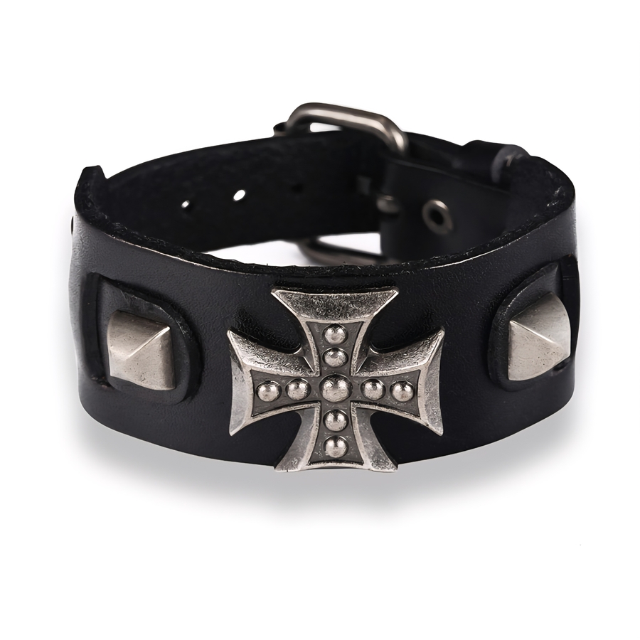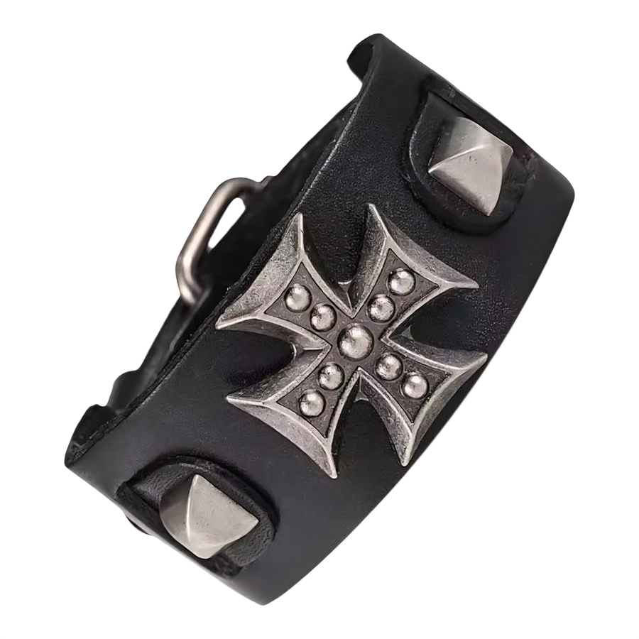 Браслет Залізний хрест BL-178 Браслет виконаний із натуральної шкіри з використанням металевої фурнітури, має застібки ремінного типу. Браслет підходить на об'єм від 18 до 22 см. Ширина браслета 33 мм.