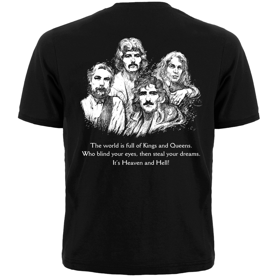 Футболка Black Sabbath "Heaven and Hell" виробництво: Gildan; тканина: 100% бавовна (якісні шви, горловина не розтягується). Щільність 160 г / м² малюнок нанесений методом шовкотрафаретного друку (не тріскається, не псується внаслідок прання, не вигорає); малюнок: фарба пластизольна виробництва EU. Прати при температурі до 30°