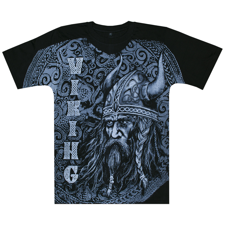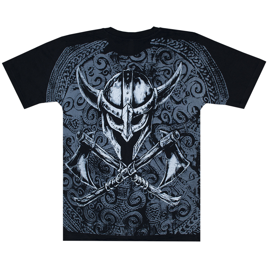 Футболка Full Print Вікінг на тлі щита з візерунками EUвиробник: Metal Heaven (EU);тканина: 100% бавовна (якісні шви, горловина не розтягується); малюнок нанесений методом шовкотрафаретного друку (не тріскається, не псується внаслідок прання, не вигорає);малюнок: фарба пластизольна виробництва EU.Прати при температурі до 30°