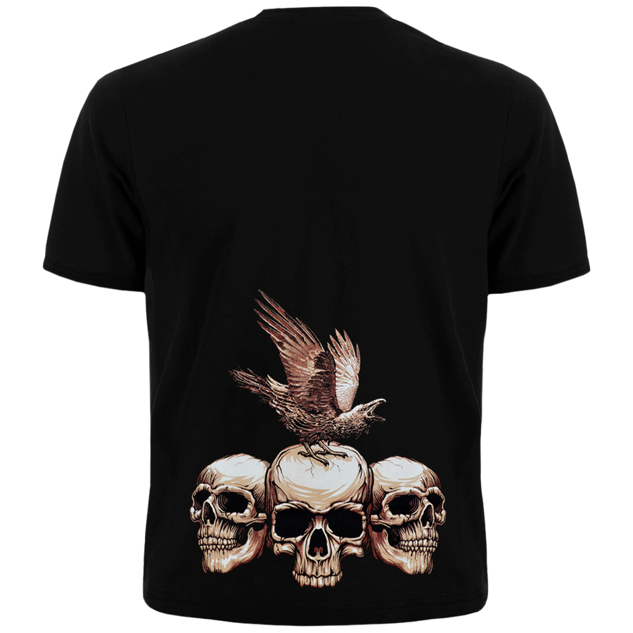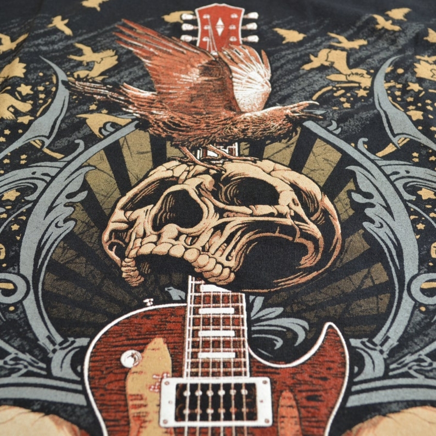 Футболка Guitar with Skulls and Ravens виробництво: Gildan;тканина: 100% бавовна (якісні шви, горловина не розтягується). Щільність 160 г / м²малюнок нанесений методом шовкотрафаретного друку (не тріскається, не псується внаслідок прання, не вигорає);малюнок: фарба пластизольна виробництва EU.Прати при температурі до 30°