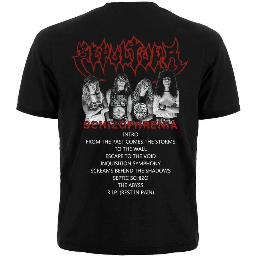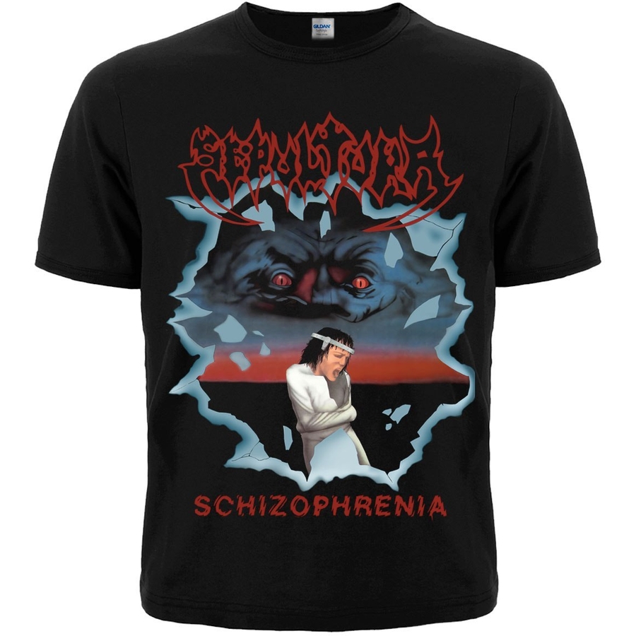Футболка Sepultura "Schizophrenia" виробництво: Gildan; тканина: 100% бавовна (якісні шви, горловина не розтягується). Щільність 160 г / м² малюнок нанесений методом шовкотрафаретного друку (не тріскається, не псується внаслідок прання, не вигорає); малюнок: фарба пластизольна виробництва EU. Прати при температурі до 30°