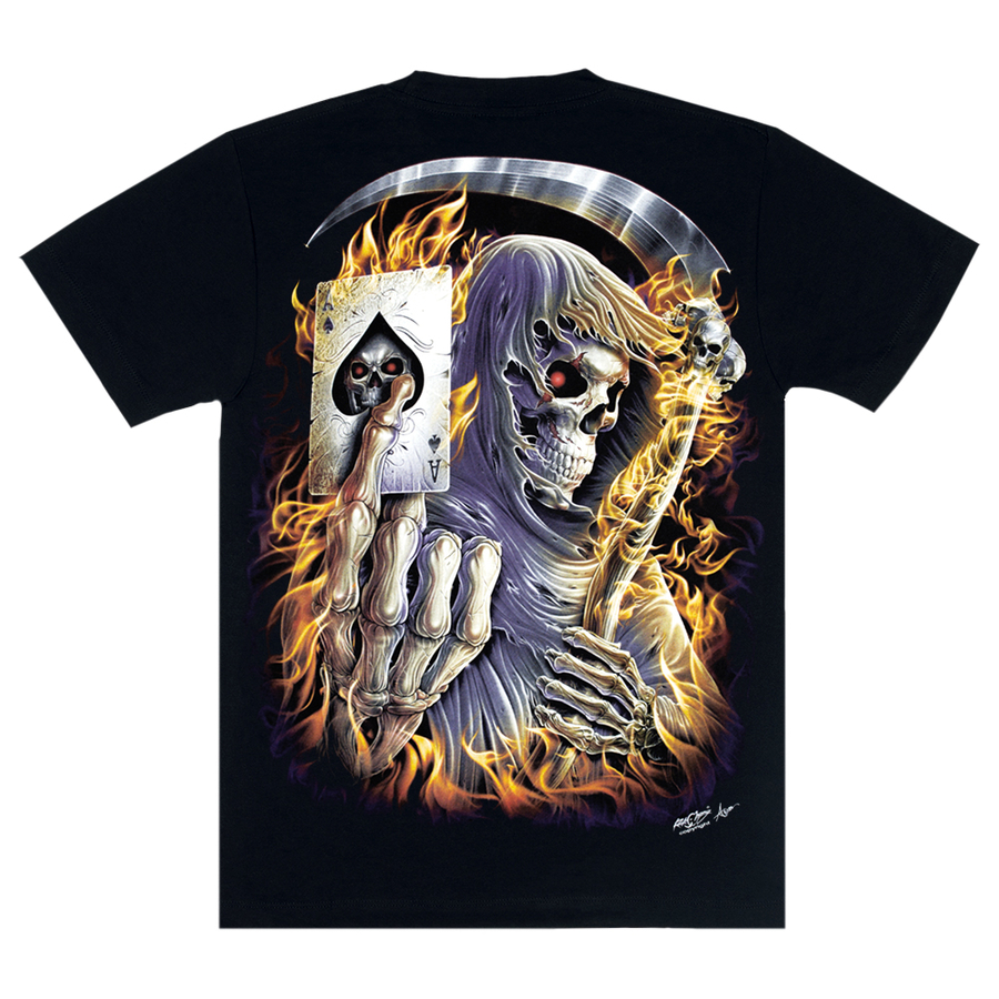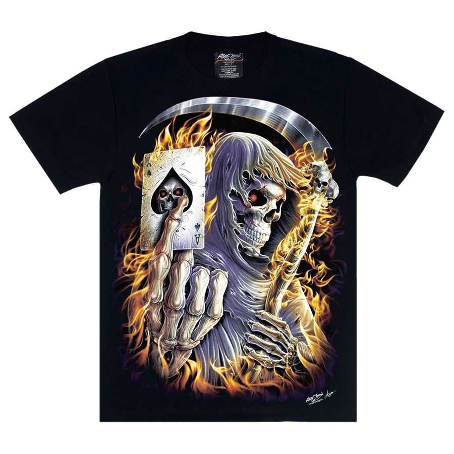 Футболка Смерть у вогні - Піковий туз (світиться в темряві)виробництво: Таїланд;виробник: Rock Chang;колекція: Man t-shirt;тканина: 100% бавовна (якісні шви, горловина не розтягується);малюнок: світиться в темряві.Прати при температурі не вище 30°