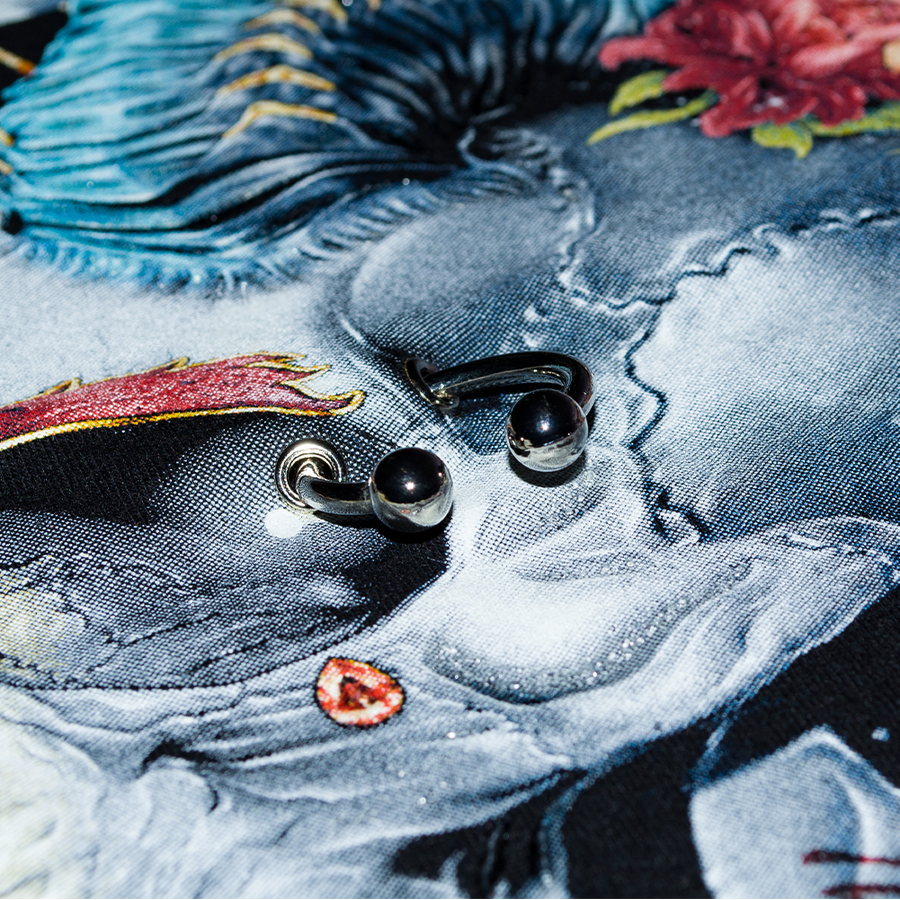 малюнок: світиться в темряві, ефект 3D, з елементами металевої фурнітури і пірсингу.