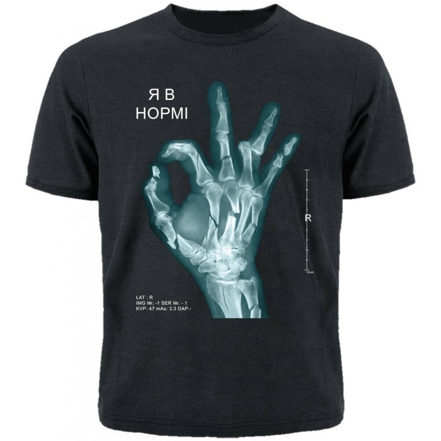 Футболка стандартного крою з круглим вирізом горловини. Має оригінальний яскравий принт, який нанесений методом шовкотрафаретного друку.