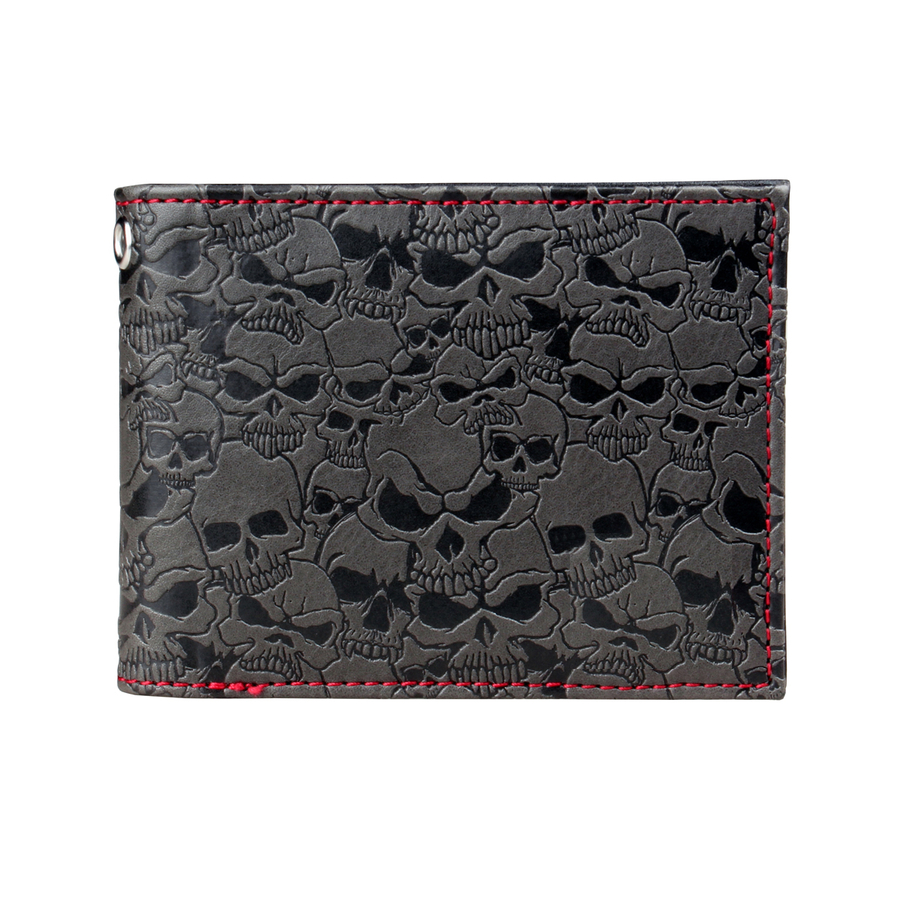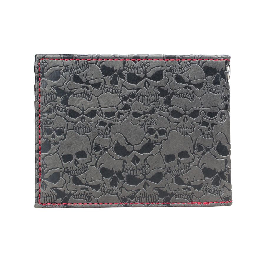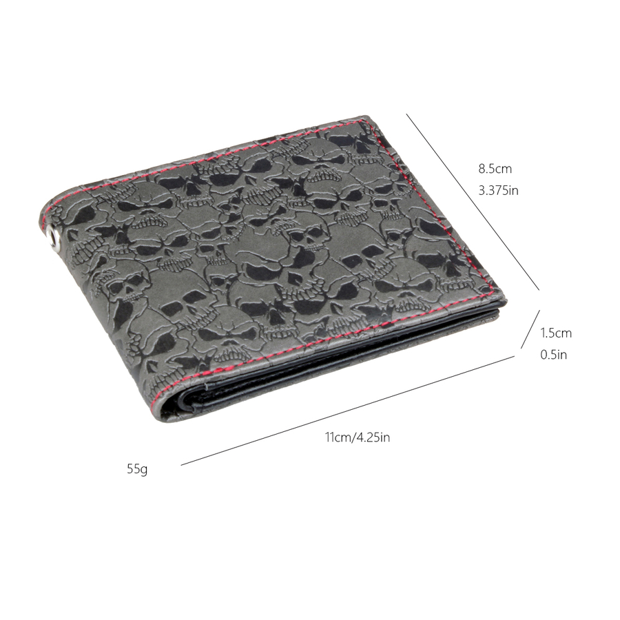 Гаманець Черепа Матеріал: екошкіра. Зображення нанесене методом тиснення. У гаманці одне велике відділення для купюр, три відділення для кредитних карт або візиток, бічні додаткові кишені та кишеня з віконцем. З торця є отвір з кільцем для ланцюжка. Розміри гаманця вказано на останньому фото
