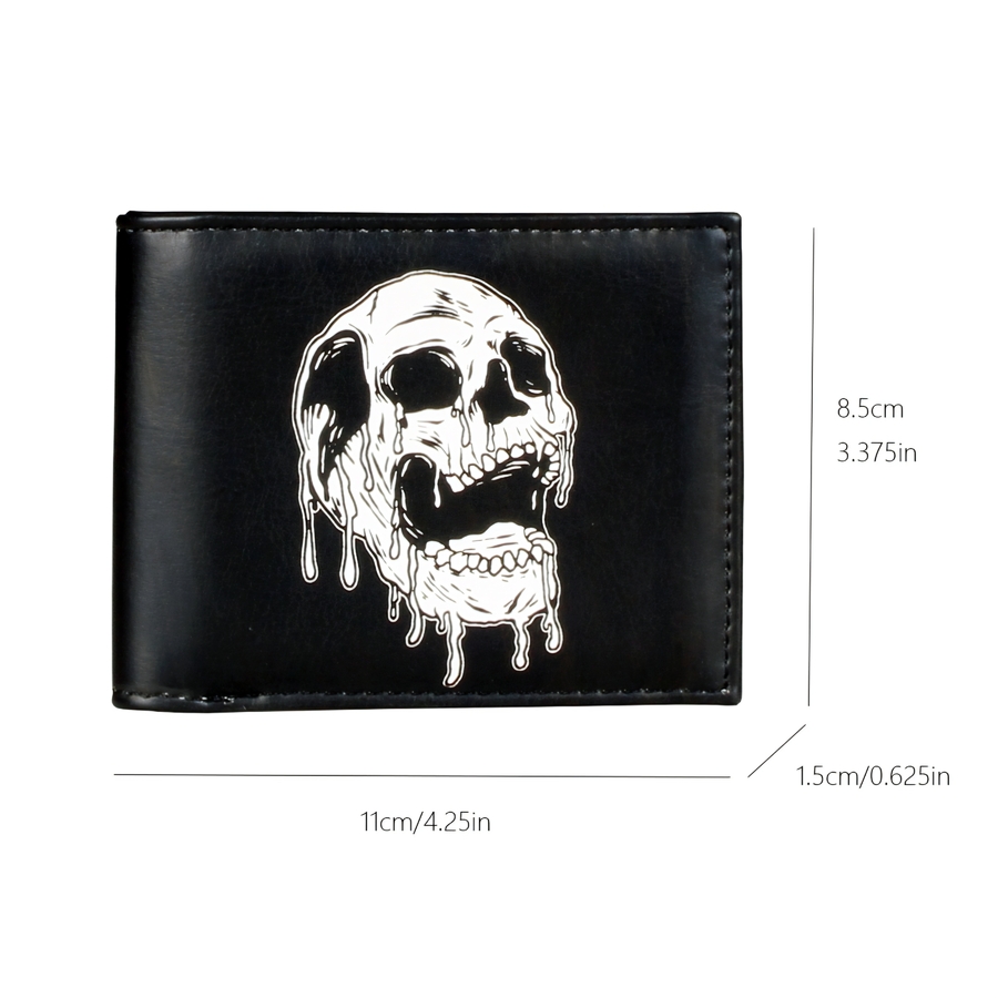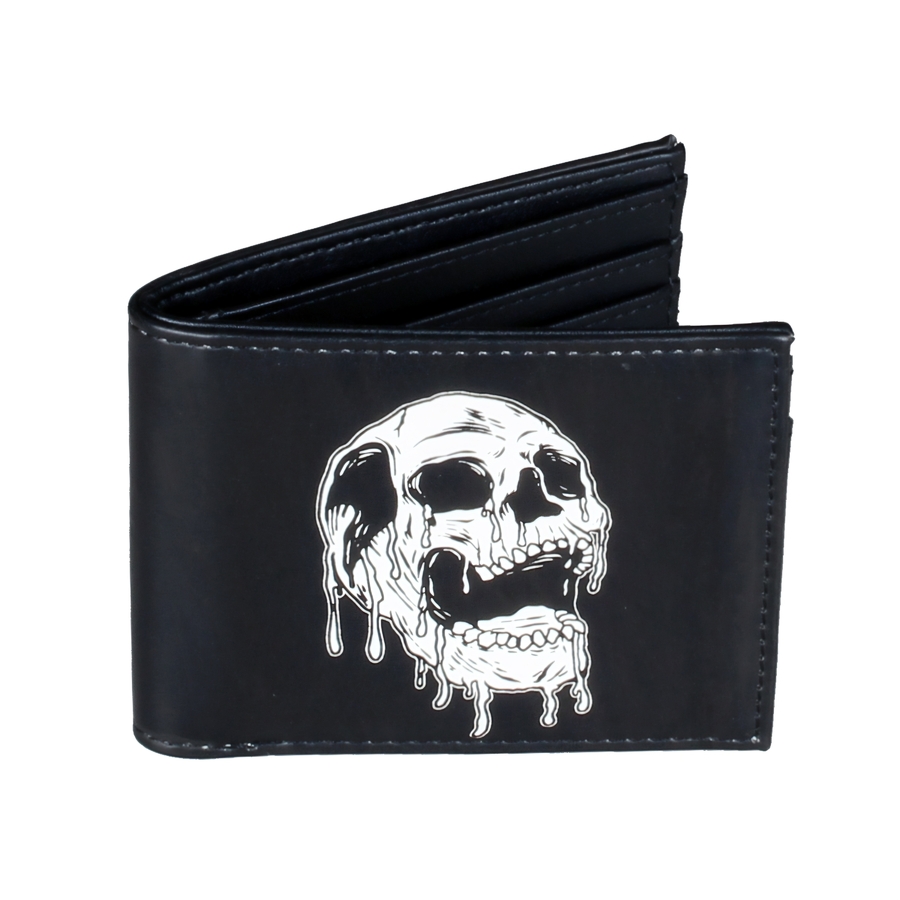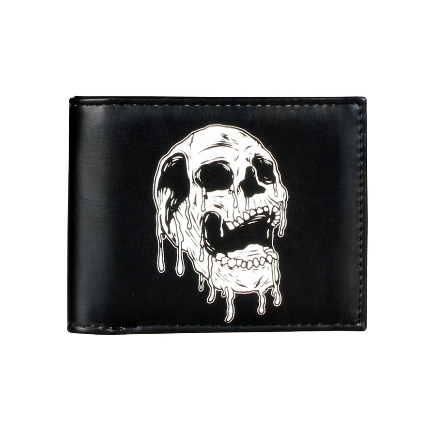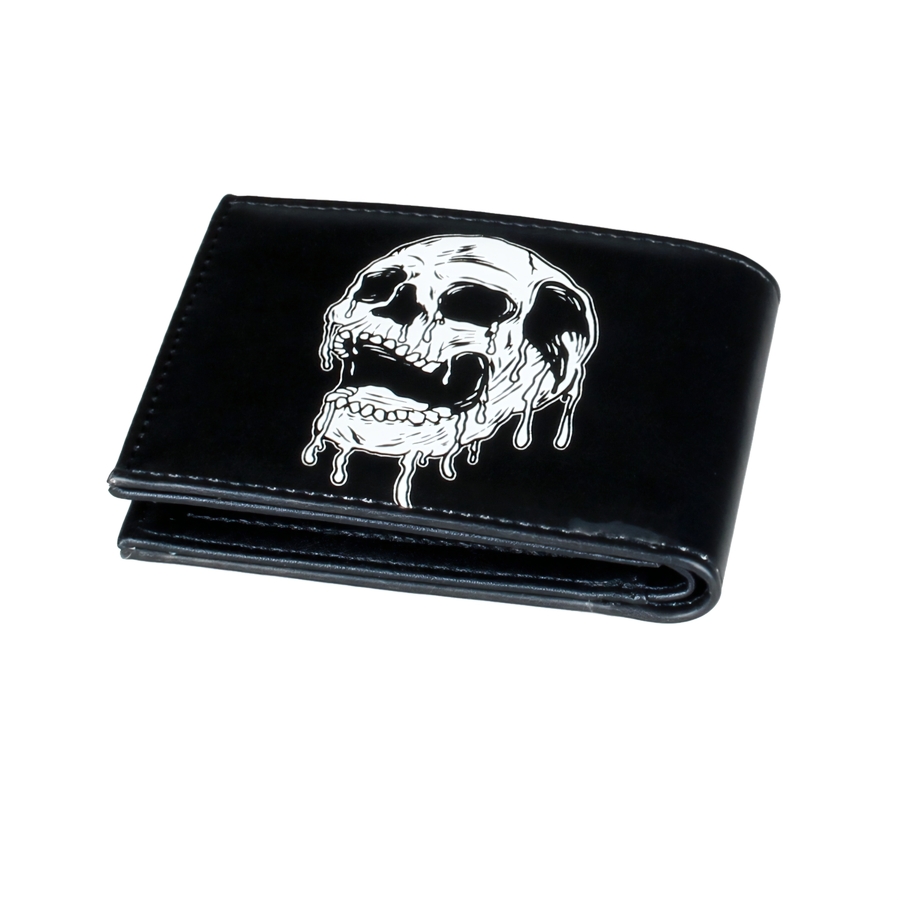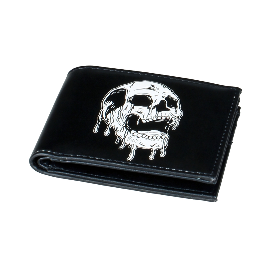 Гаманець Skull Матеріал: екошкіра Малюнок нанесений методом шовкотрафаретного друку. У гаманці одне велике відділення для купюр, три відділення для кредитних карт або візиток, бічні додаткові кишені та кишеня з віконцем. Розміри гаманця вказано на останньому фото