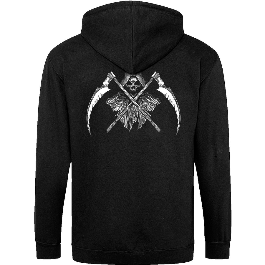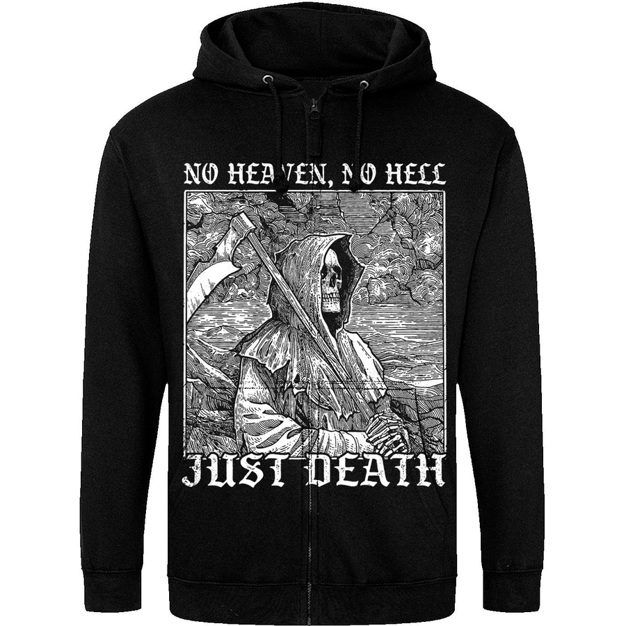 Худі на блискавці Just Hoods - No Heaven, No Hell - Just Death Худі оснащене прихованою блискавкою та подвійним тканинним капюшоном зі шнурками в тон. Має кишені та ребристі манжети на рукавах і по низу виробу. Тканина тринитка на флісі, склад: 80% бавовна, 20% поліестер, щільність 280 г/м². Бренд Just Hoods (або AWDis Just Hoods) належить британській компанії та виробляється у Великій Британії. Одяг бренду виробляється на заводах, сертифікованих за стандартом WRAP (Worldwide Responsible Accredited Production), що підтверджує відповідність міжнародним нормам, тому цей одяг завжди високої якості.