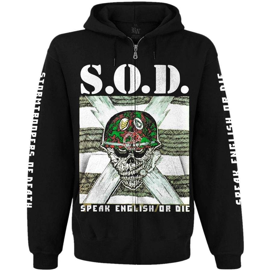 Худі S.O.D. "Speak English or Die" на блискавці виробництво: Rockway; тканина: 80% - бавовна, 20% - поліестер; малюнок нанесений методом шовкотрафаретного друку (не тріскається, не псується внаслідок прання, не вигорає); малюнок: фарба пластизольна виробництва EU. Прати при температурі не вище 30°