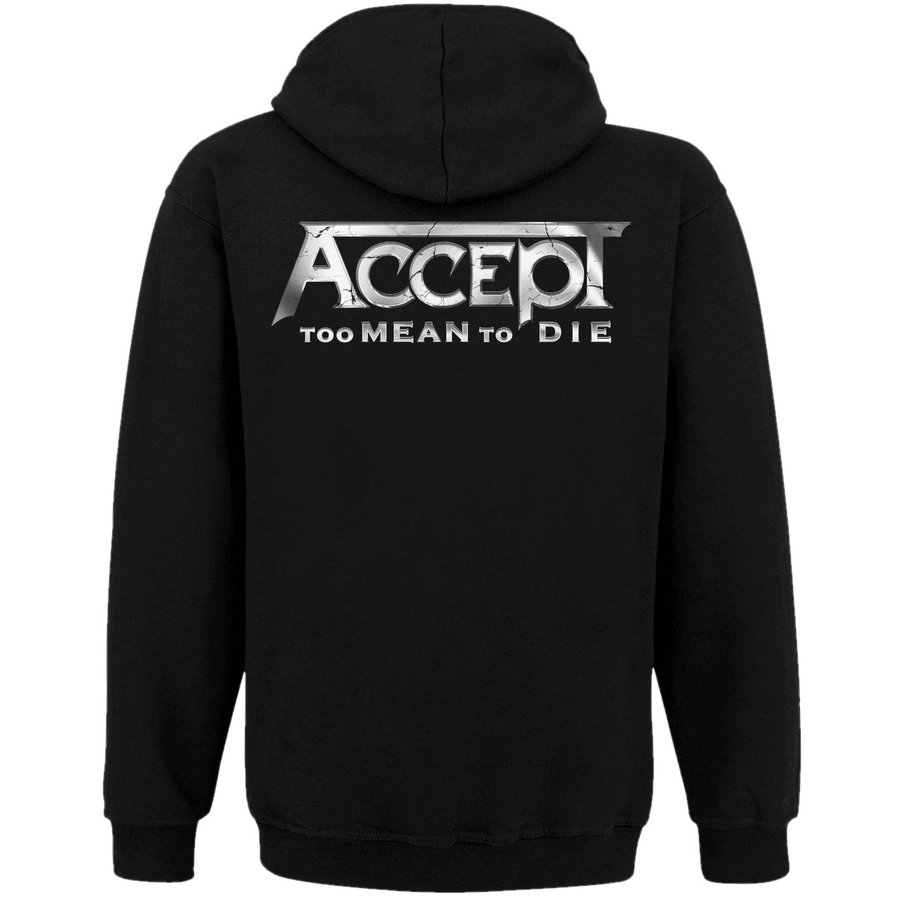 Худі Accept "Too Mean to Die" на блискавцівиробництво: Rockway;тканина: 80% - бавовна, 20% - поліестер;малюнок нанесений методом шовкотрафаретного друку (не тріскається, не псується внаслідок прання, не вигорає);малюнок: фарба пластизольна виробництва EU.Прати при температурі не вище 30°