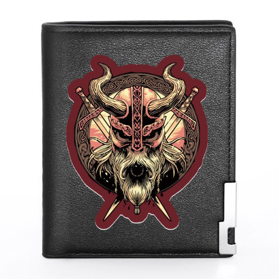 Гаманець Вікінг з мечами Матеріал: екошкіраМалюнок нанесений методом шовкотрафаретного друку.У гаманці два великих відділення для купюр, шість відділень для кредитних карт або візиток і чотири бічні додаткові кишені.