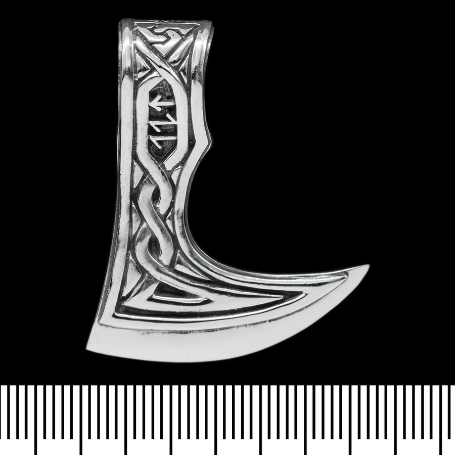 Кулон Сокира Перуна з візерунком та рунами (срібло, 925 проба) (sp-128) 11,95 грамм, висота 37 мм, ширина 31 мм, розмір вушка для ланцюжка 10х7 мм