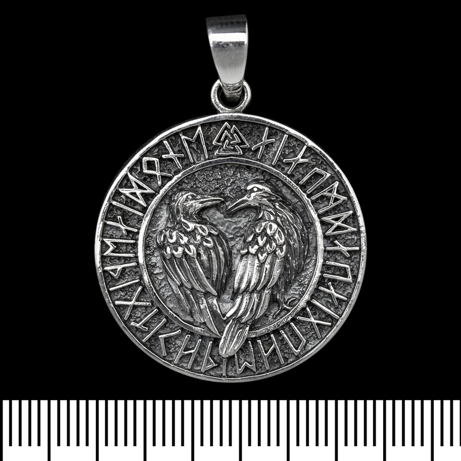 Кулон Ворони Одіна в рунічному колі з Валкнутом (срібло, 925 проба) (sp-172) 7,5 грамм, діаметр 29 мм, розмір вушка для ланцюжка 6х4 мм