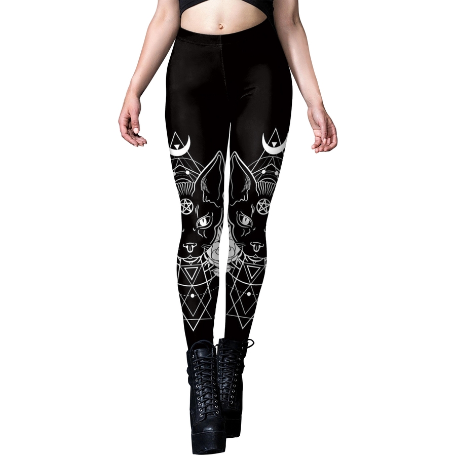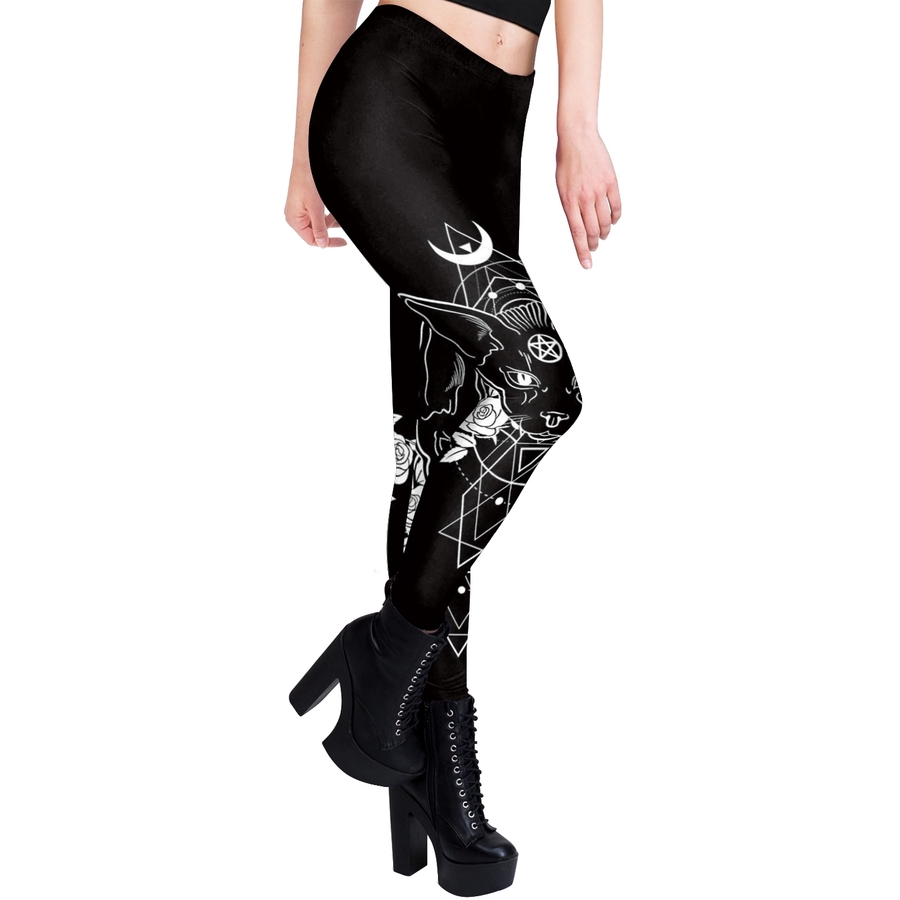 Легінси Esoteric Cat Якісні легінси з щільної тканини, що добре тягнеться. Зображення нанесено методом термохімічного сублімаційного друку (не відчувається на тканині, не вистирається). Склад тканини 88% поліестр, 12% спандекс. Будьте уважними при виборі, легінси підходять на наступні параметри: об'єм талії 67-83 см, об'єм стегон 100-120 см, довжина 94 см.