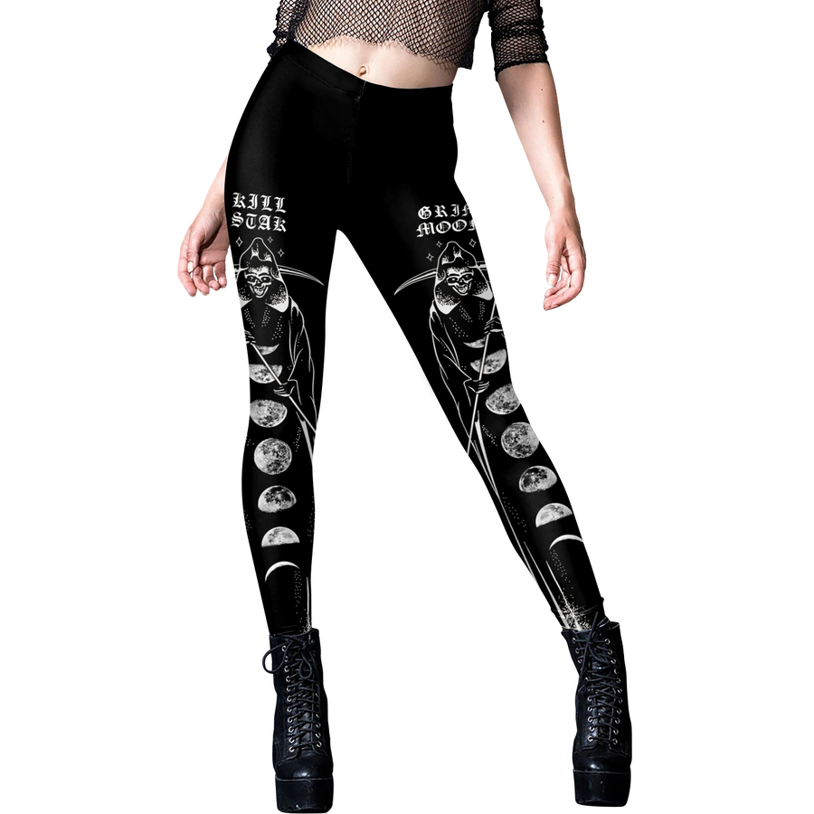 Легінси Grim Moon Якісні легінси з щільної тканини, що добре тягнеться. Зображення нанесено методом термохімічного сублімаційного друку (не відчувається на тканині, не вистирається). Склад тканини 88% поліестр, 12% спандекс. Будьте уважними при виборі, легінси підходять на наступні параметри: об'єм талії 67-83 см, об'єм стегон 100-120 см, довжина 94 см.