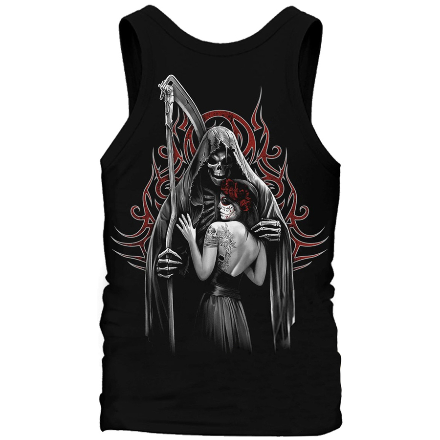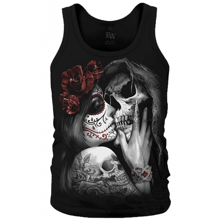 Майка Muerte (Kiss of Death)Майка Rockwayвиробництво: Україна;тканина: 100% бавовна (якісні шви, горловина не розтягується);малюнок нанесений методом шовкотрафаретного друку (не тріскається, не псується внаслідок прання, не вигорає);малюнок: фарба пластизольна, виробництва EU.Прати при температурі не вище 30°