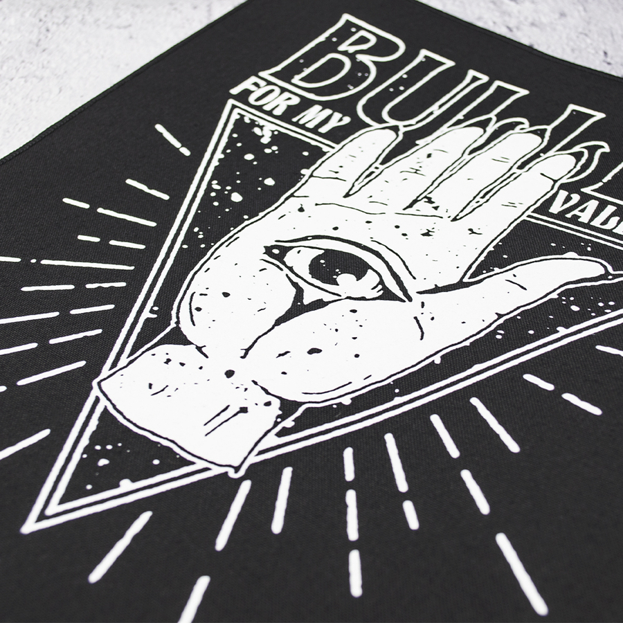 Нашивка наспинна катана BULLET FOR MY VALENTINE - ALL SEEING EYE (olbp-077) Висота 36 см, ширина по верхньому краю 29 см, ширина по нижньому краю 26 см Цей товар є офіційним ліцензованим мерчем (Officially Licensed Backpath). Наспинна нашивка високої преміум якості. Краї нашивки оброблені оверлоком, завдяки чому виріб виглядає максимально акуратним. Зображення нанесене методом шовкотрафаретного друку, висока деталізація свідчить про неперевершену якість виробу. Нашивка пришивна, м'яка, ідеально повторюватиме вигини на одязі. Склад тканини: бавовна/поліестер. Зроблено у Великій Британії