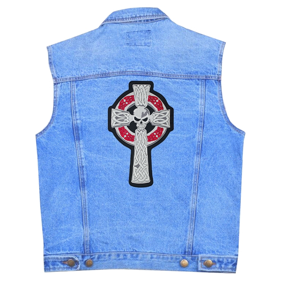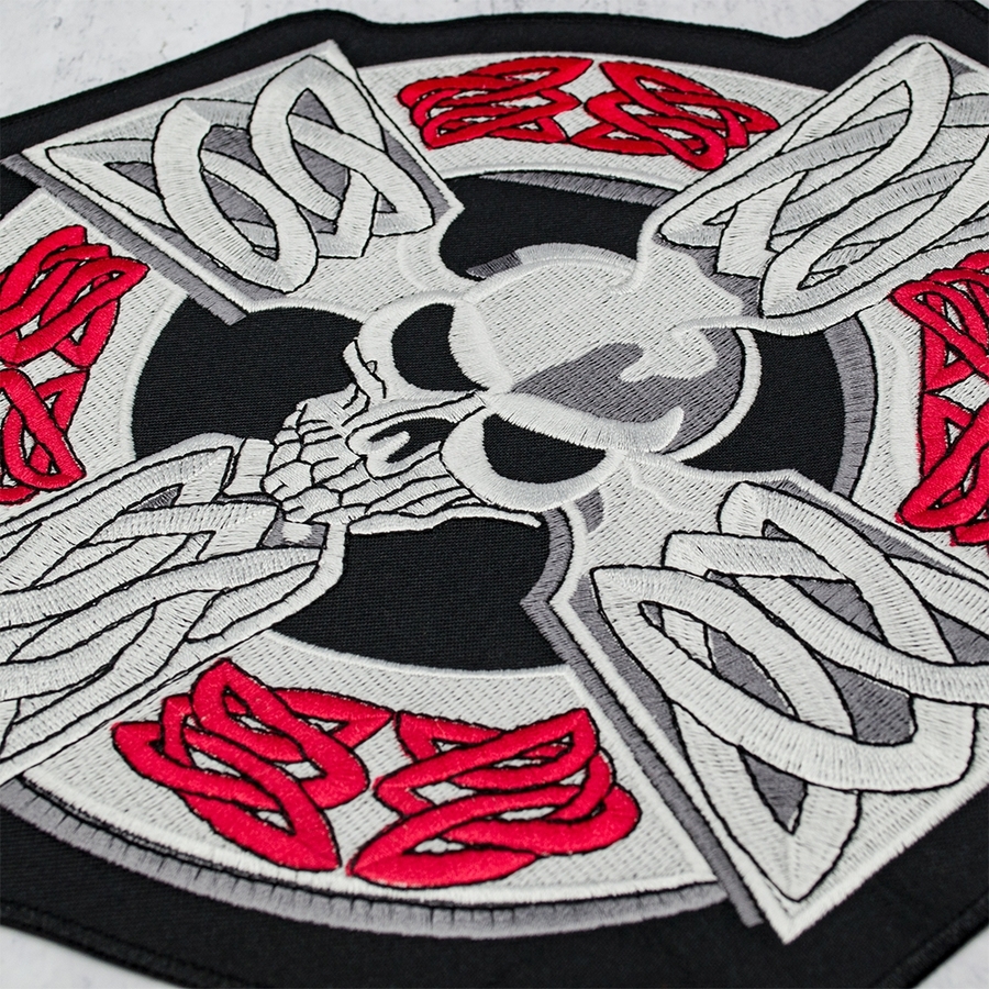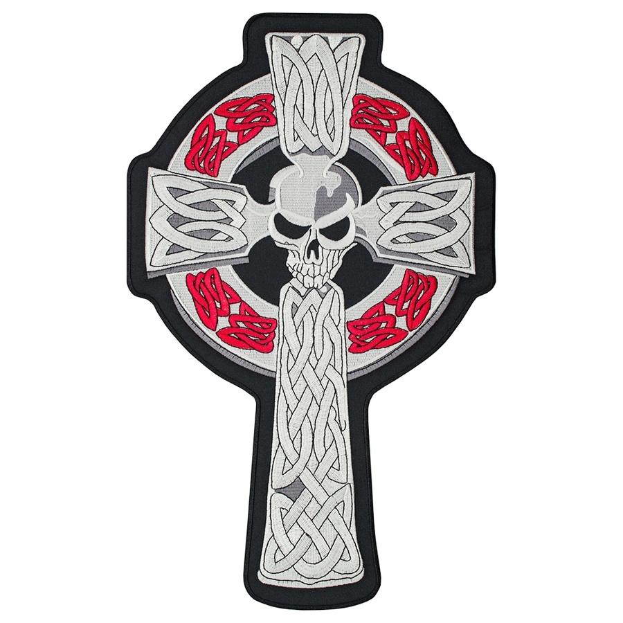 Нашивка термо Кельтський хрест з черепом та червоним візерунком наспинна (thps-071) Розмір – ширина 22,5 см, висота 36 см