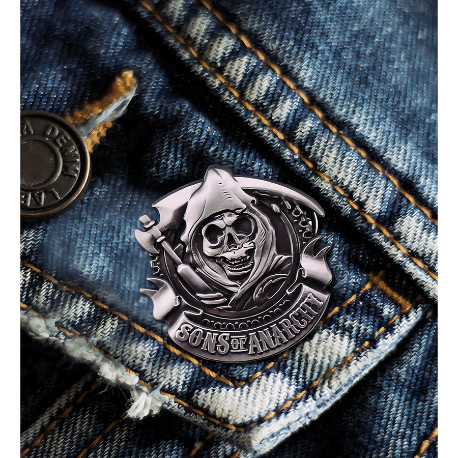 Цей аксесуар відтворює легендарну емблему мотоклубу SAMCRO - Смерть із косою із культового серіалу "Сини анархії". Присвячений: байкерам - символ прихильності до «1%» та класичного байкерського руху; шанувальникам серіалу SOA, хто слідкує за історією Джакса Теллера та цінує атмосферу серіалу; також пін органічно вписується в гардероб поціновувачів важкої музики. Символ Свободи та Братерства, додай до свого образу дух бунтарства. Компактний розмір дозволяє кастомізувати косуху, джинсовий жилет, рюкзак або кепку. Пін оснащений двома штифтами з металевими затискачами-метеликами на звороті, що забезпечує стабільну фіксацію та запобігає прокручуванню на одязі. Виготовлений з міцного металевого сплаву