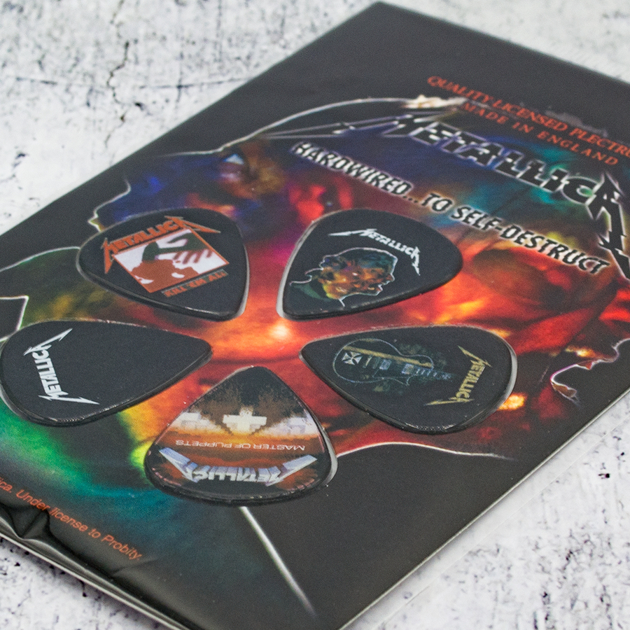 Подарунковий набір медіаторів METALLICA - HARDWIRED TO SELF DESTRUCT (mol-003) Цей товар є офіційним ліцензованим мерчем (Officially Licensed). Медіатори з якісним деталізованим зображенням виготовлені з ПВХ, товщина 1.14 мм, гнучкість відповідає медіаторам класифікації medium. Кожен набір із п'яти медіаторів упакований у блістер на картонній основі зі стилізованим зображенням гурту чи альбому, якому присвячений конкретний набір, має презентабельний вигляд, це ідеальний подарунок для справжніх фанатів гурту, для початківців та професійних музикантів і як просто справді гарний та оригінальний сувенір. Зроблено у Англії.